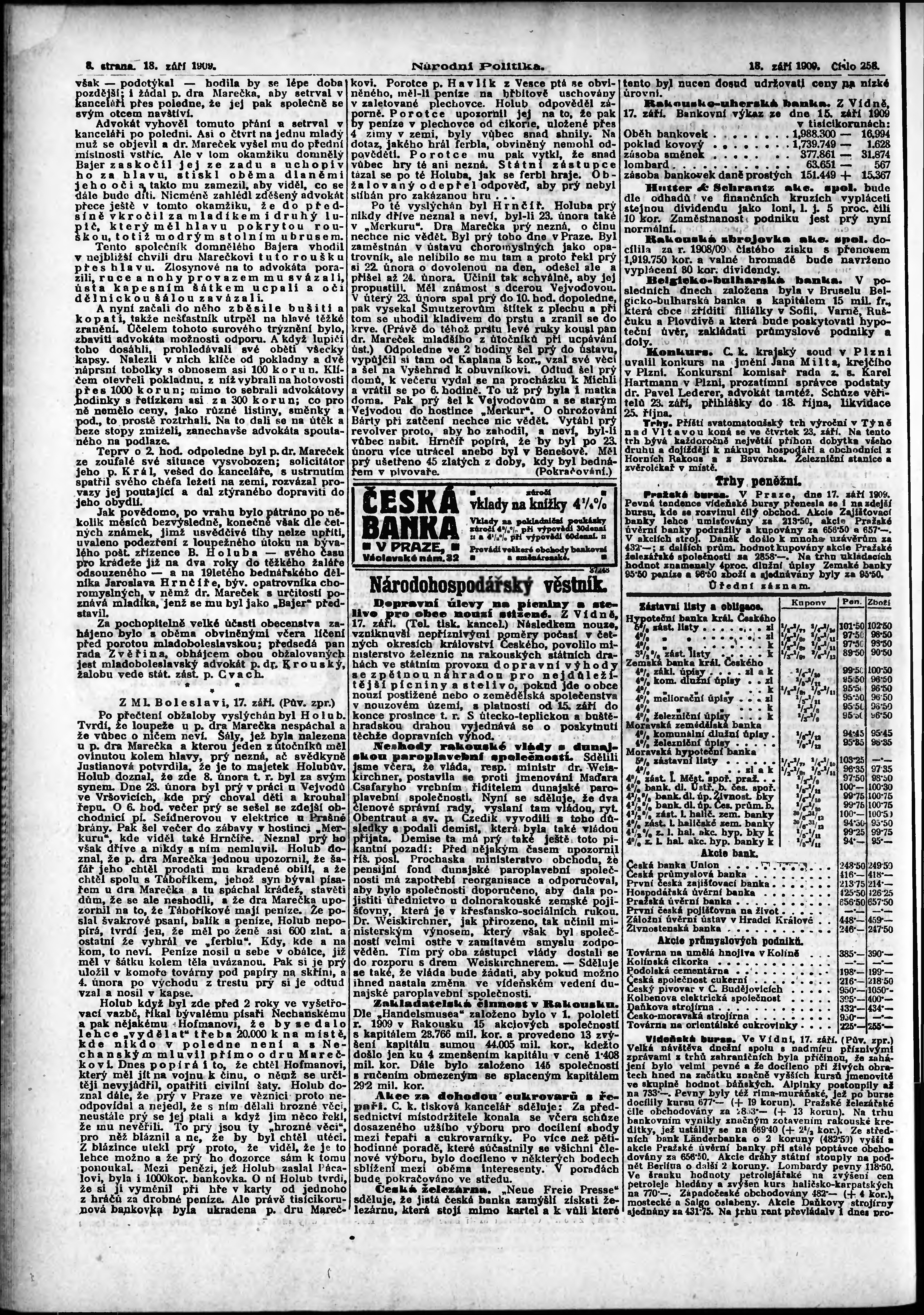 * Datum vydání výtisku: 18.9.1909 Číslo výtisku: 258