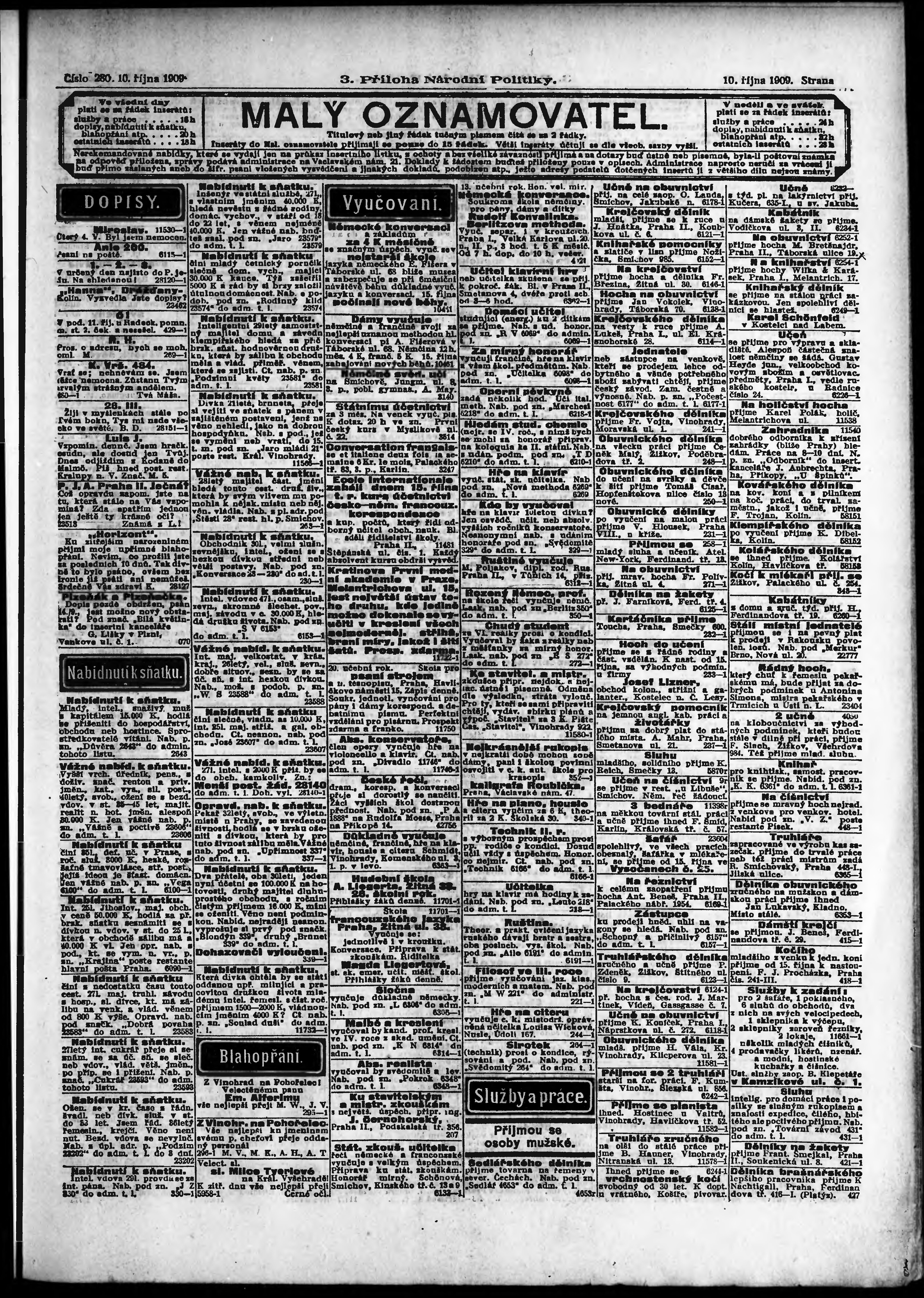 * Datum vydání výtisku: 10.10.1909 Číslo výtisku: 280 Typ výtisku: příloha Poznámky k výtisku: 3. příloha;