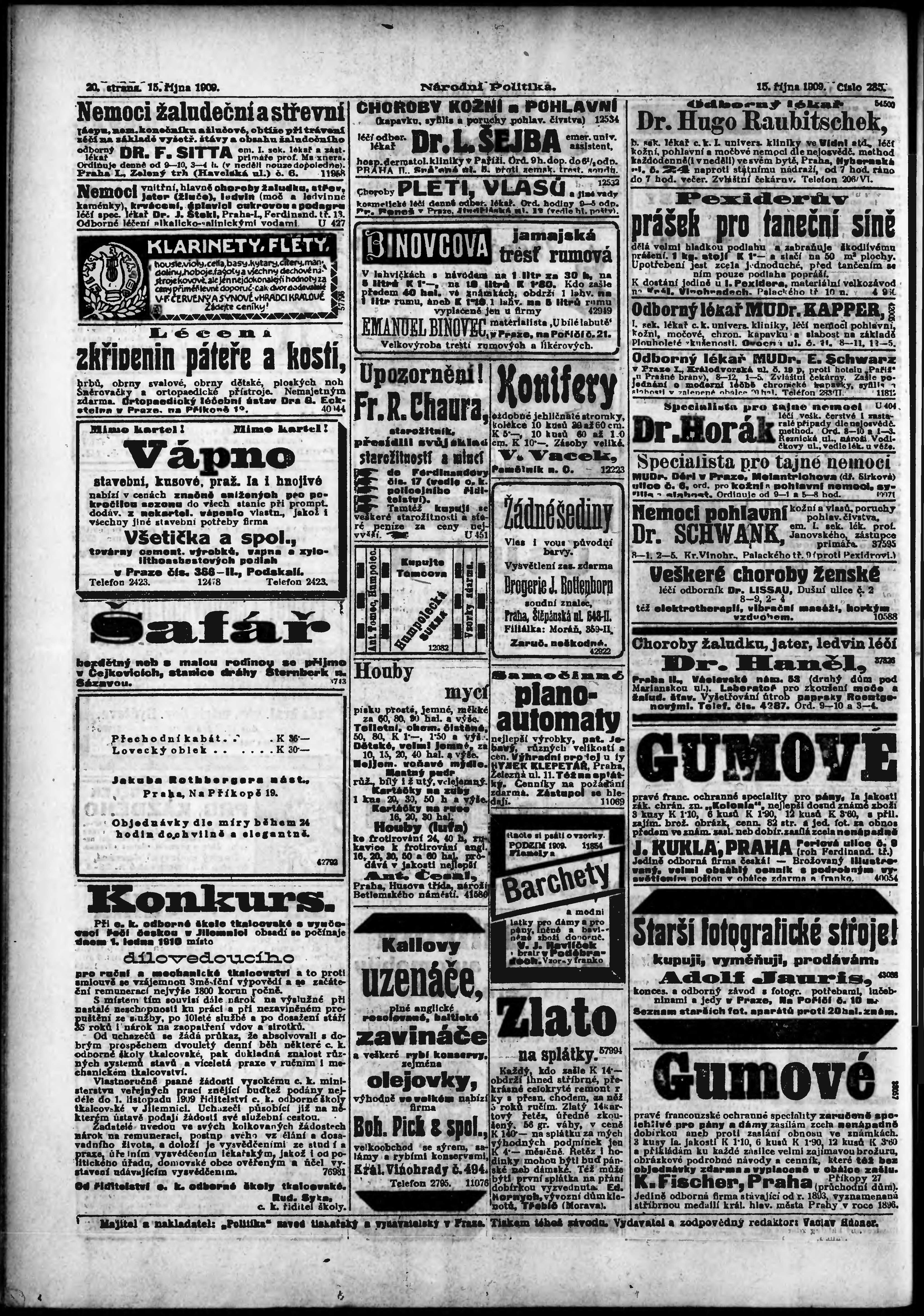 * Datum vydání výtisku: 15.10.1909 Číslo výtisku: 285