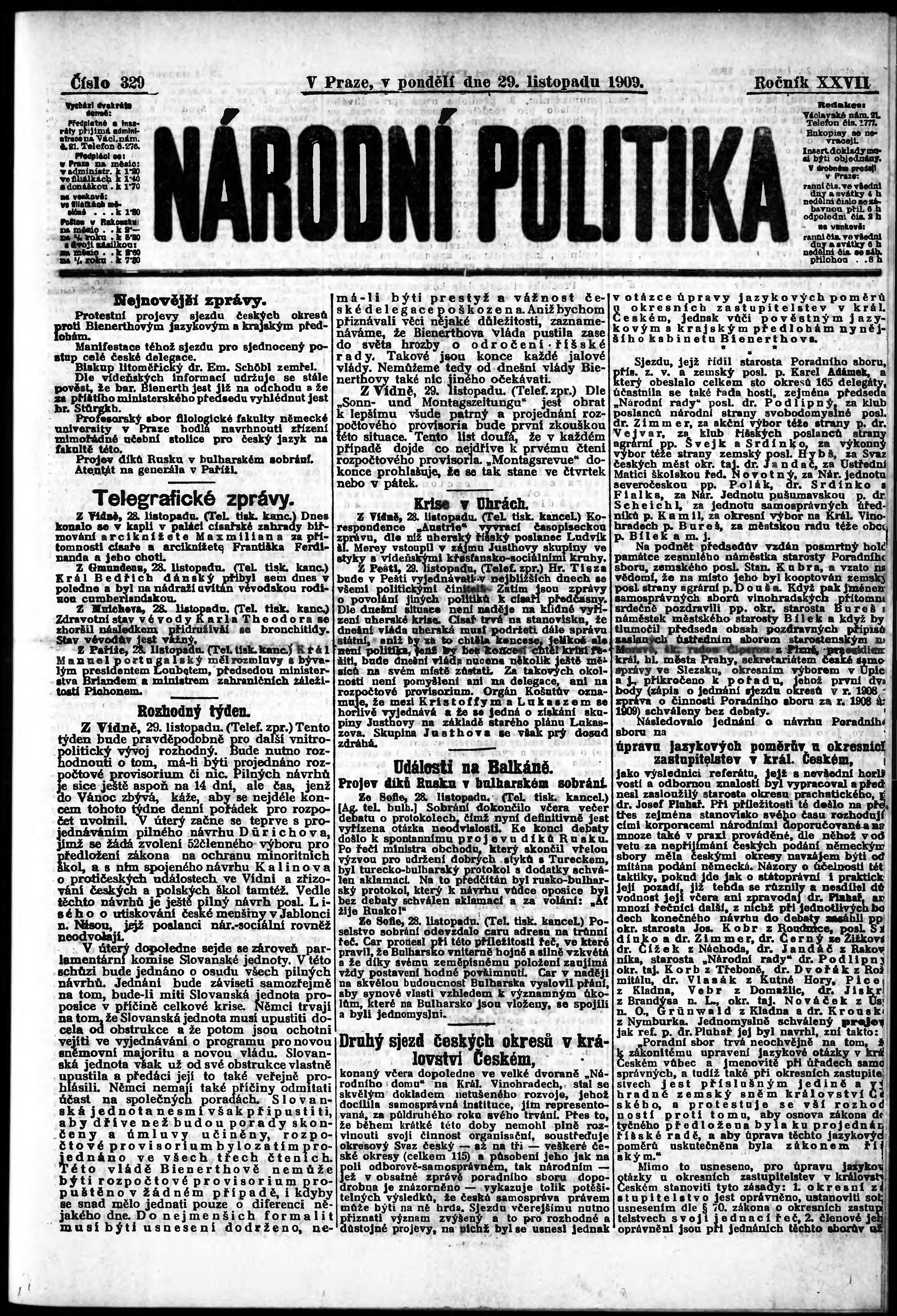 * Datum vydání výtisku: 29.11.1909 Číslo výtisku: 329