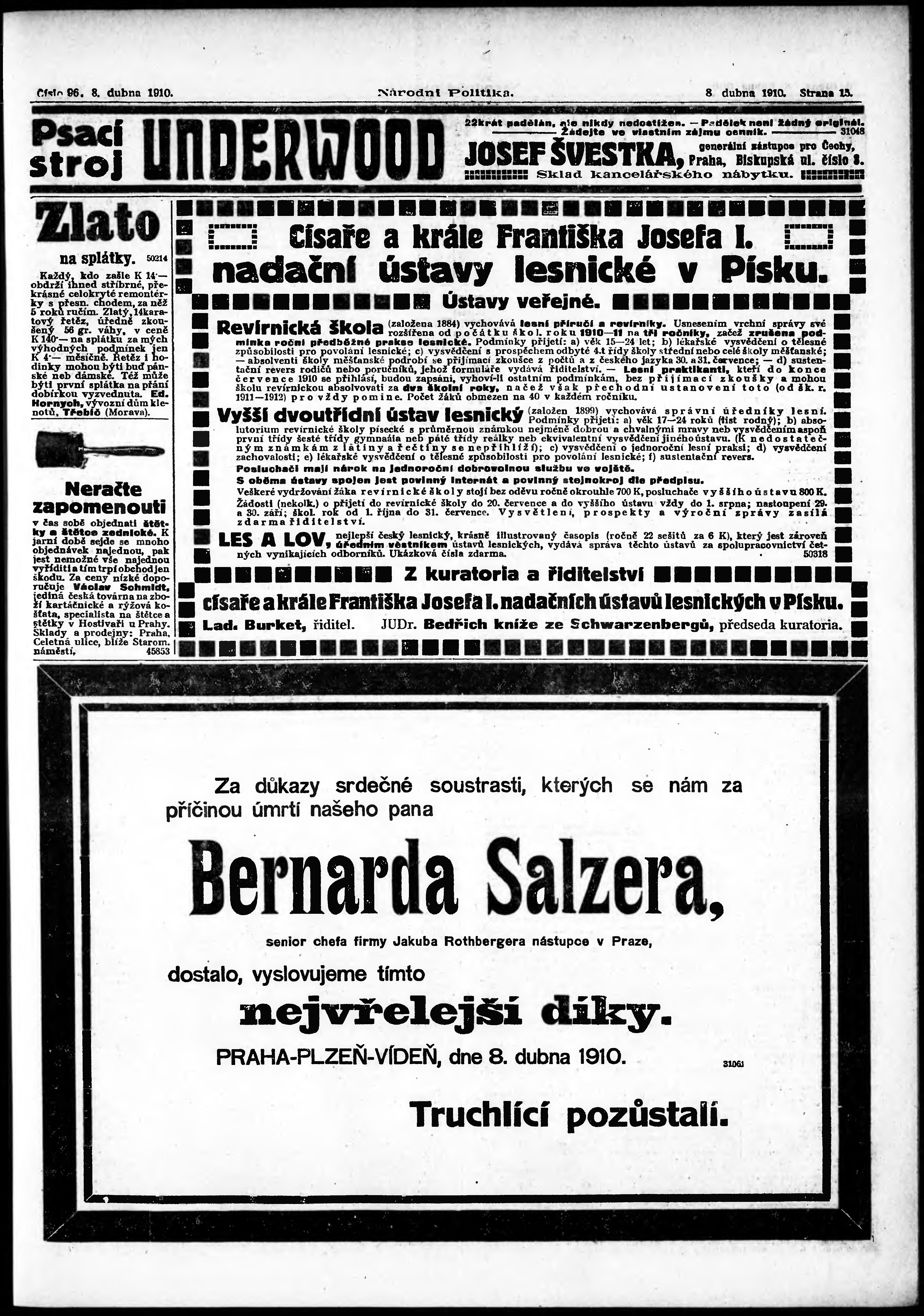 * Datum vydání výtisku: 8.4.1910 Číslo výtisku: 96 Poznámky k výtisku: s. 13 - 14 není k dispozici;
