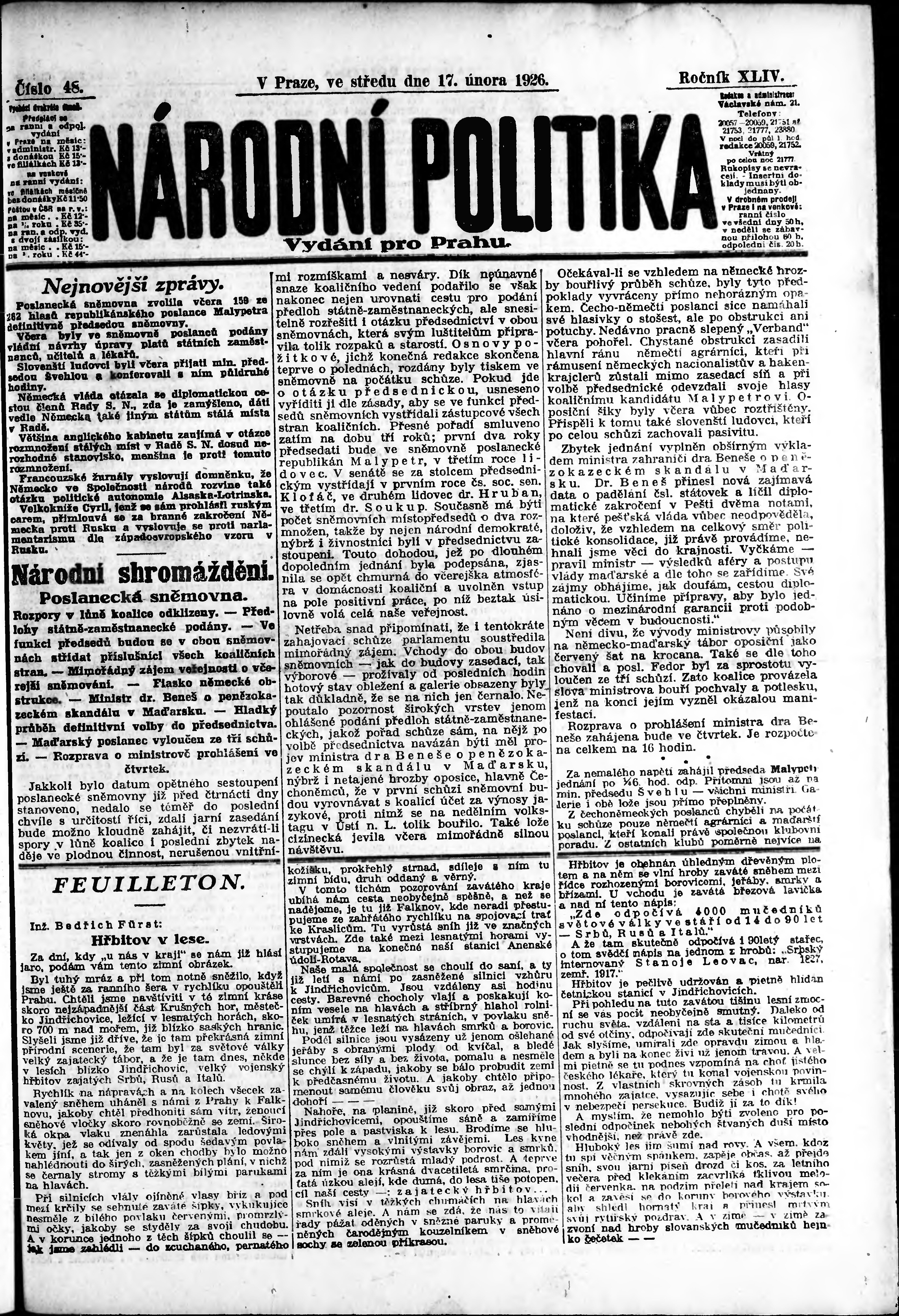* Datum vydání výtisku: 17.2.1926 Číslo výtisku: 48 Poznámky k výtisku: ranní vydání; vydání pro Prahu;