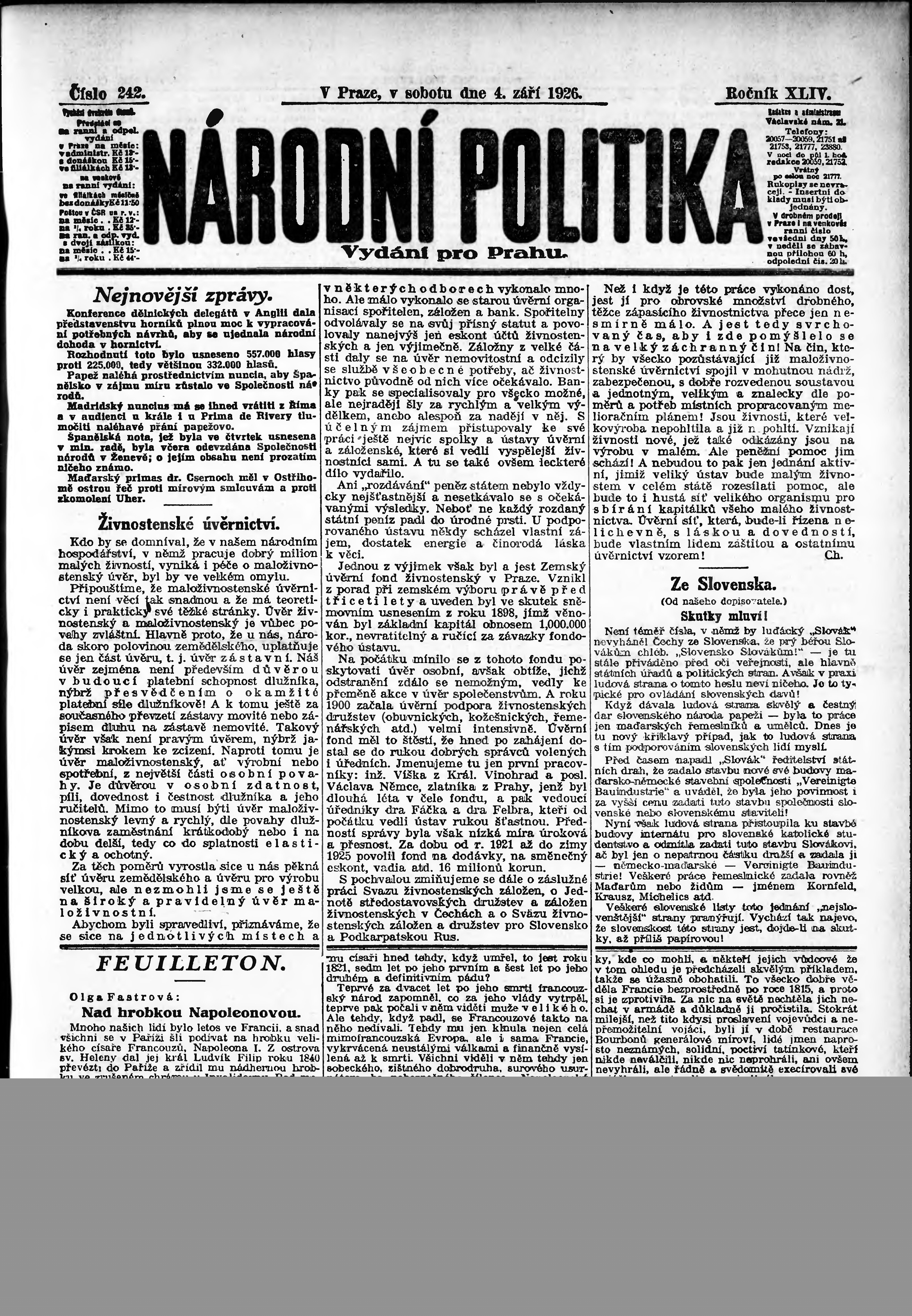 * Datum vydání výtisku: 4.9.1926 Číslo výtisku: 242 Poznámky k výtisku: ranní vydání; vydání pro Prahu;
