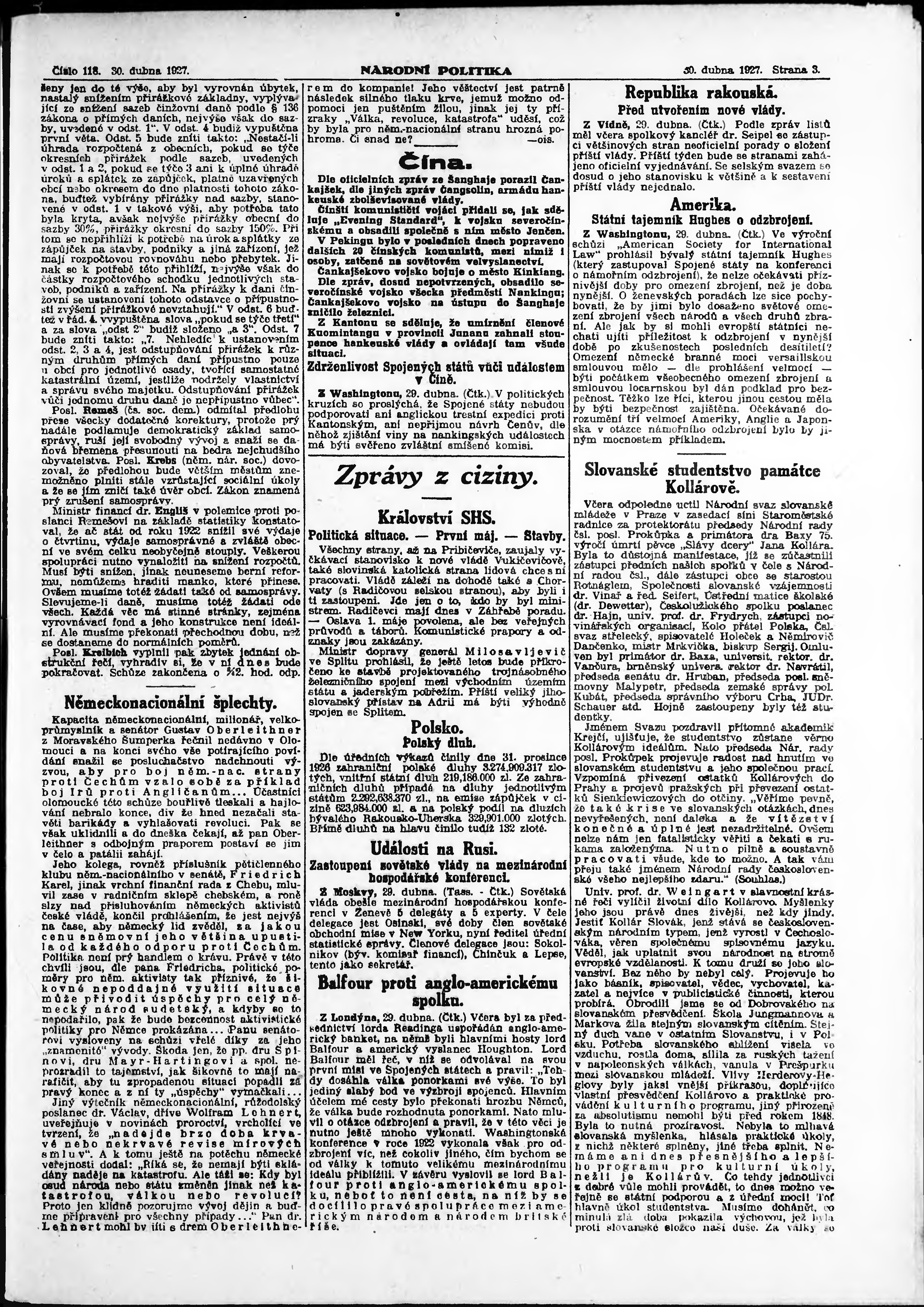 * Datum vydání výtisku: 30.4.1927 Číslo výtisku: 118 Poznámky k výtisku: ranní vydání; vydání pro Prahu;
