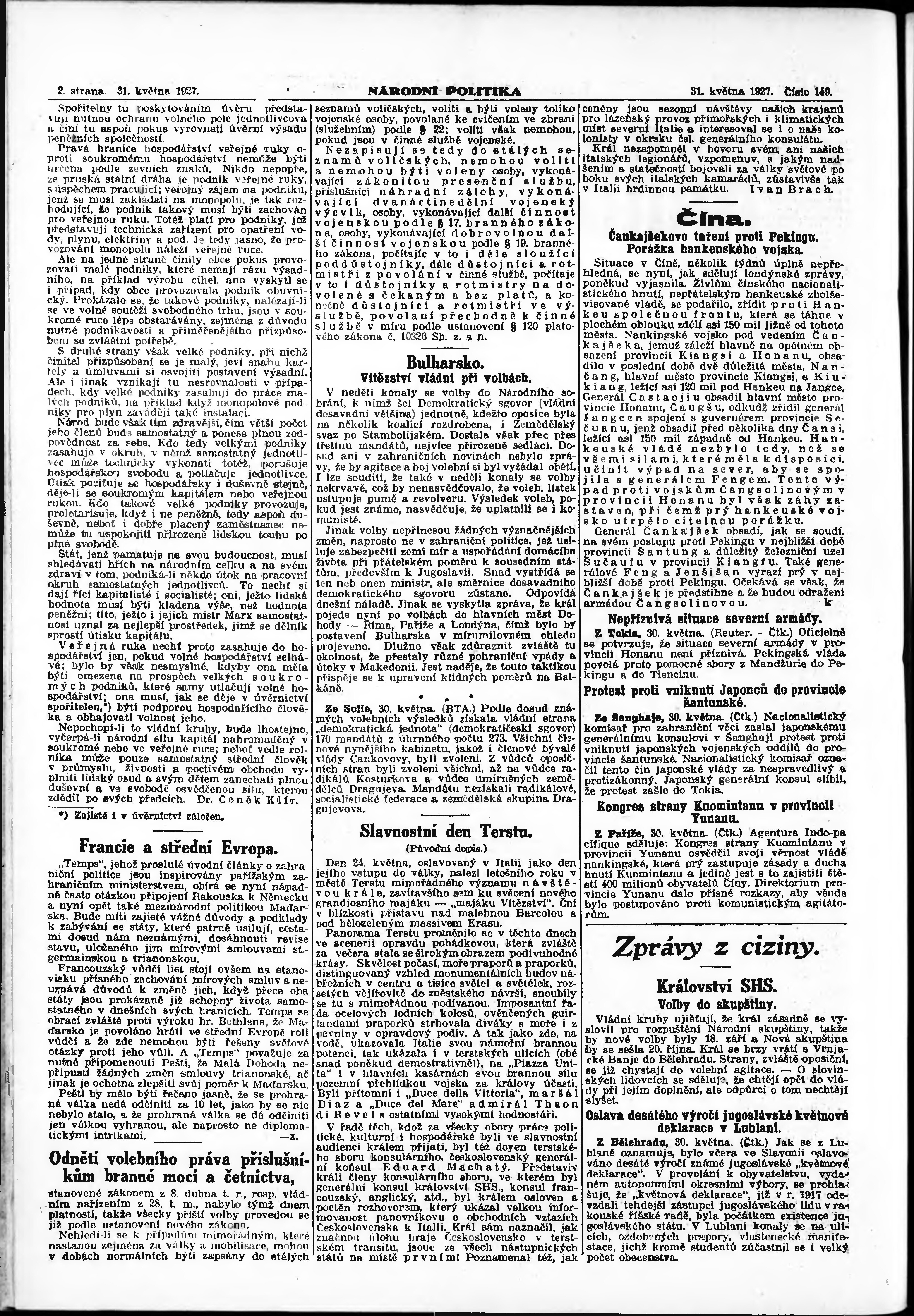 * Datum vydání výtisku: 31.5.1927 Číslo výtisku: 149 Poznámky k výtisku: ranní vydání; vydání pro Prahu;