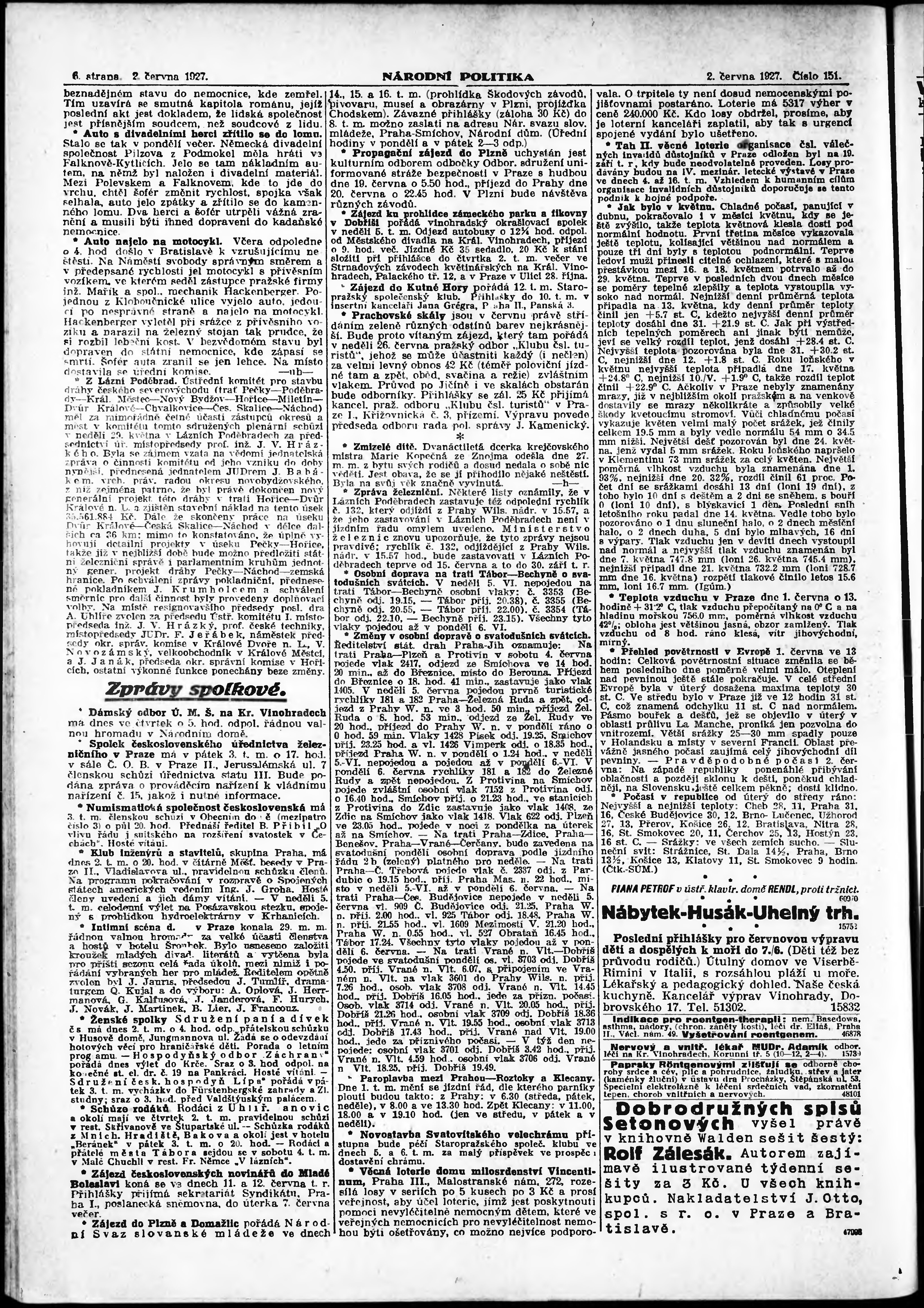 * Datum vydání výtisku: 2.6.1927 Číslo výtisku: 151 Poznámky k výtisku: ranní vydání; vydání pro Prahu;
