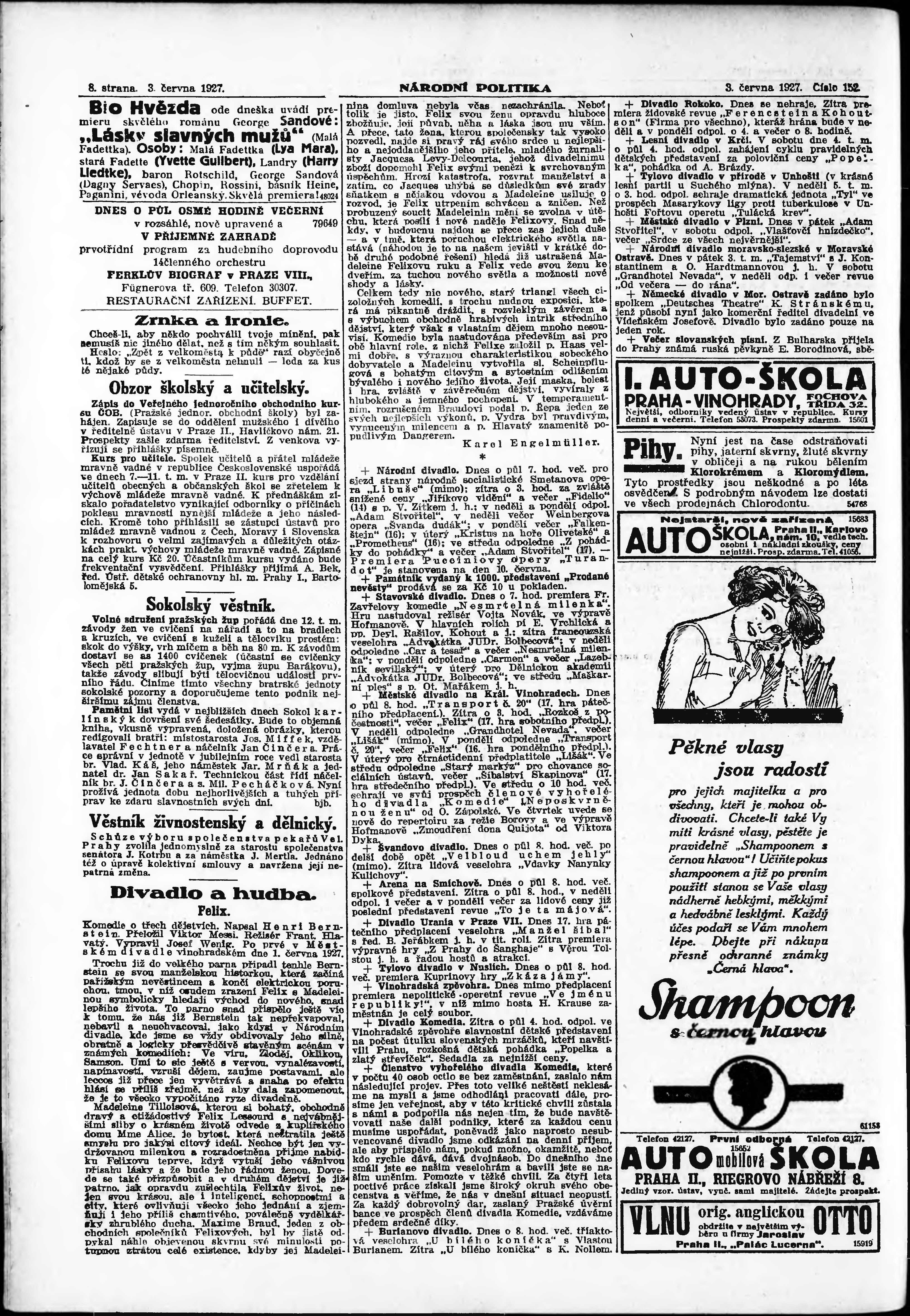 * Datum vydání výtisku: 3.6.1927 Číslo výtisku: 152 Poznámky k výtisku: ranní vydání; vydání pro Prahu;