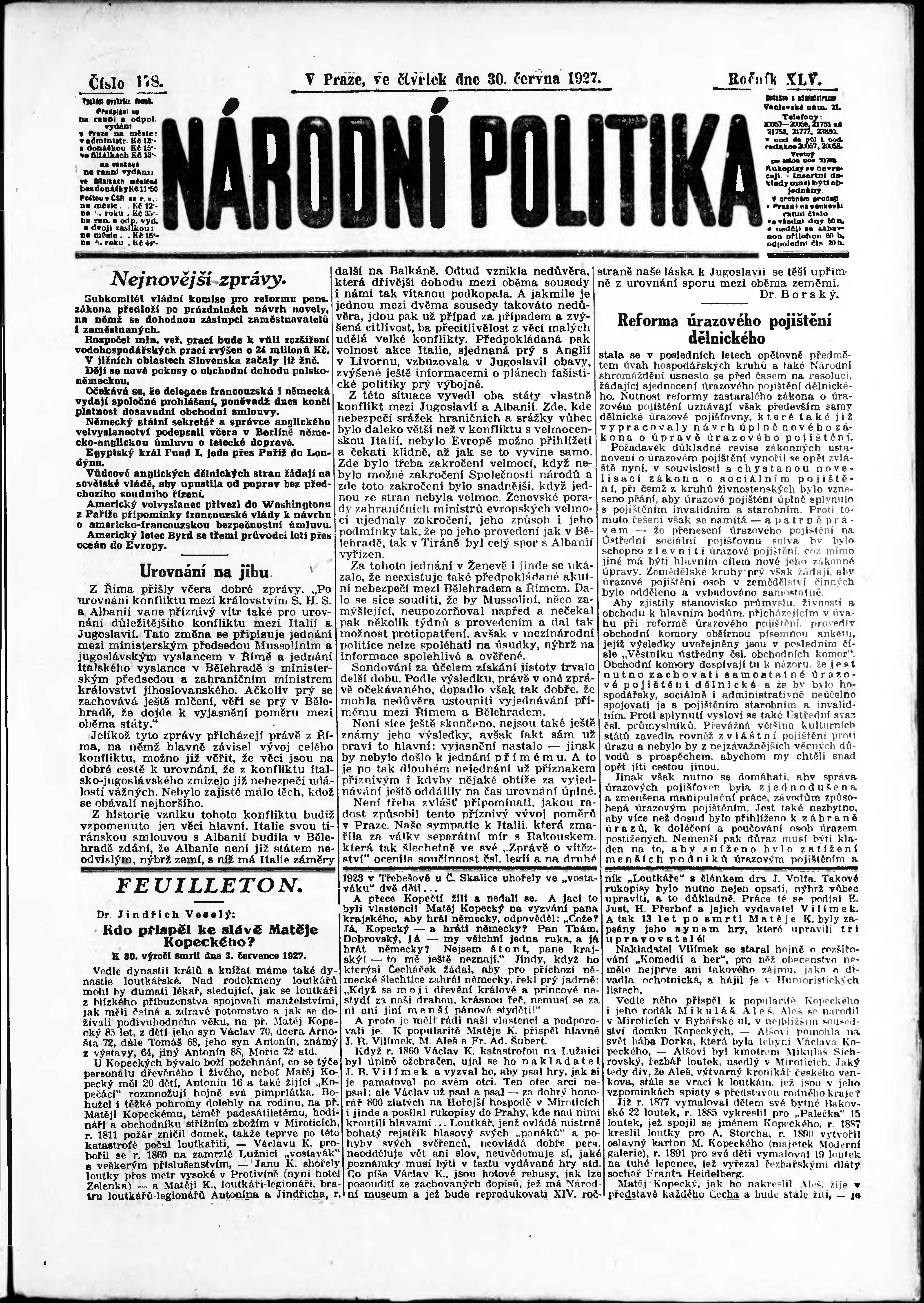 * Datum vydání výtisku: 30.6.1927 Číslo výtisku: 178 Poznámky k výtisku: ranní vydání;