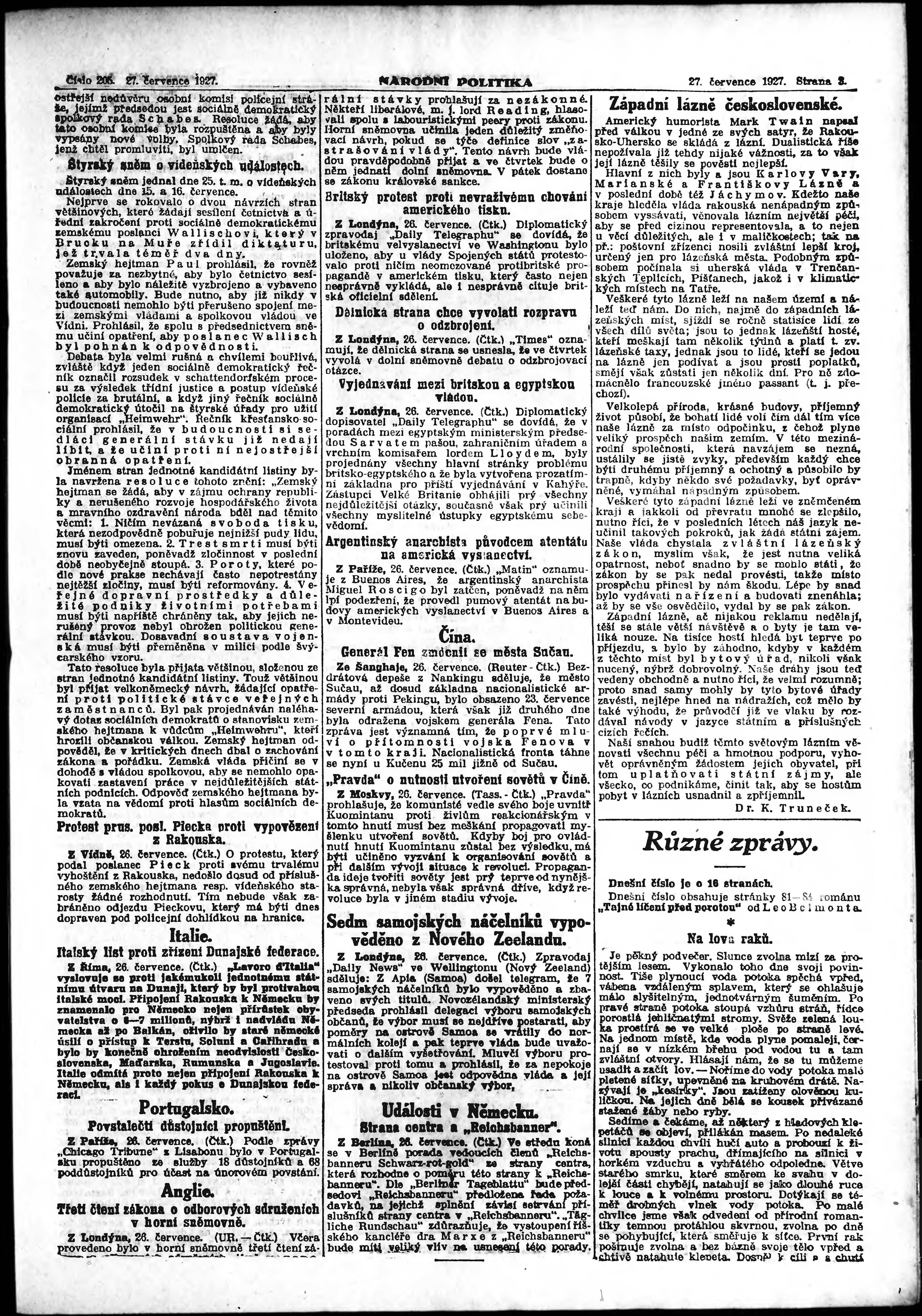 * Datum vydání výtisku: 27.7.1927 Číslo výtisku: 205 Poznámky k výtisku: ranní vydání; vydání pro Prahu;