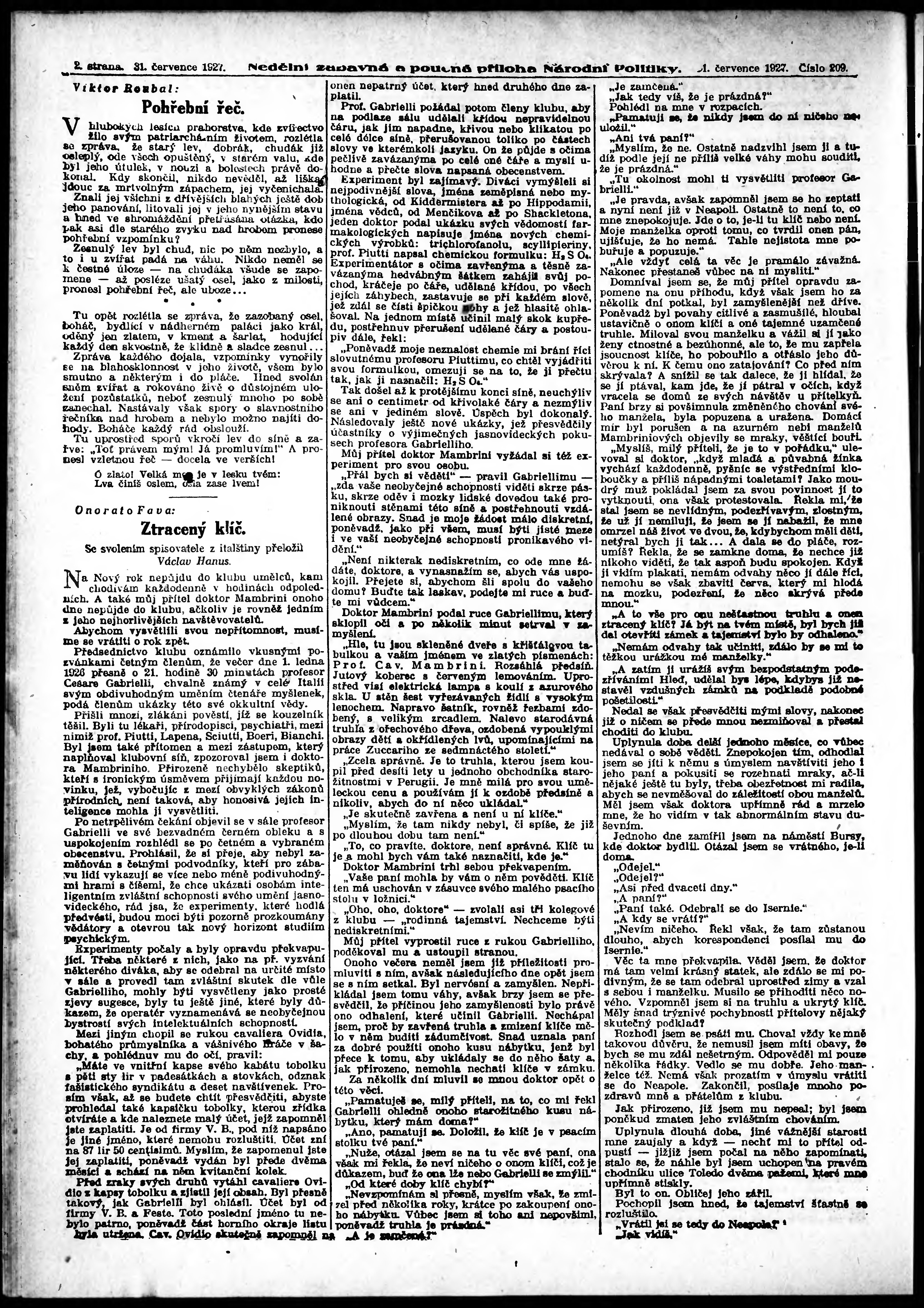 * Datum vydání výtisku: 31.7.1927 Číslo výtisku: 209 Typ výtisku: příloha