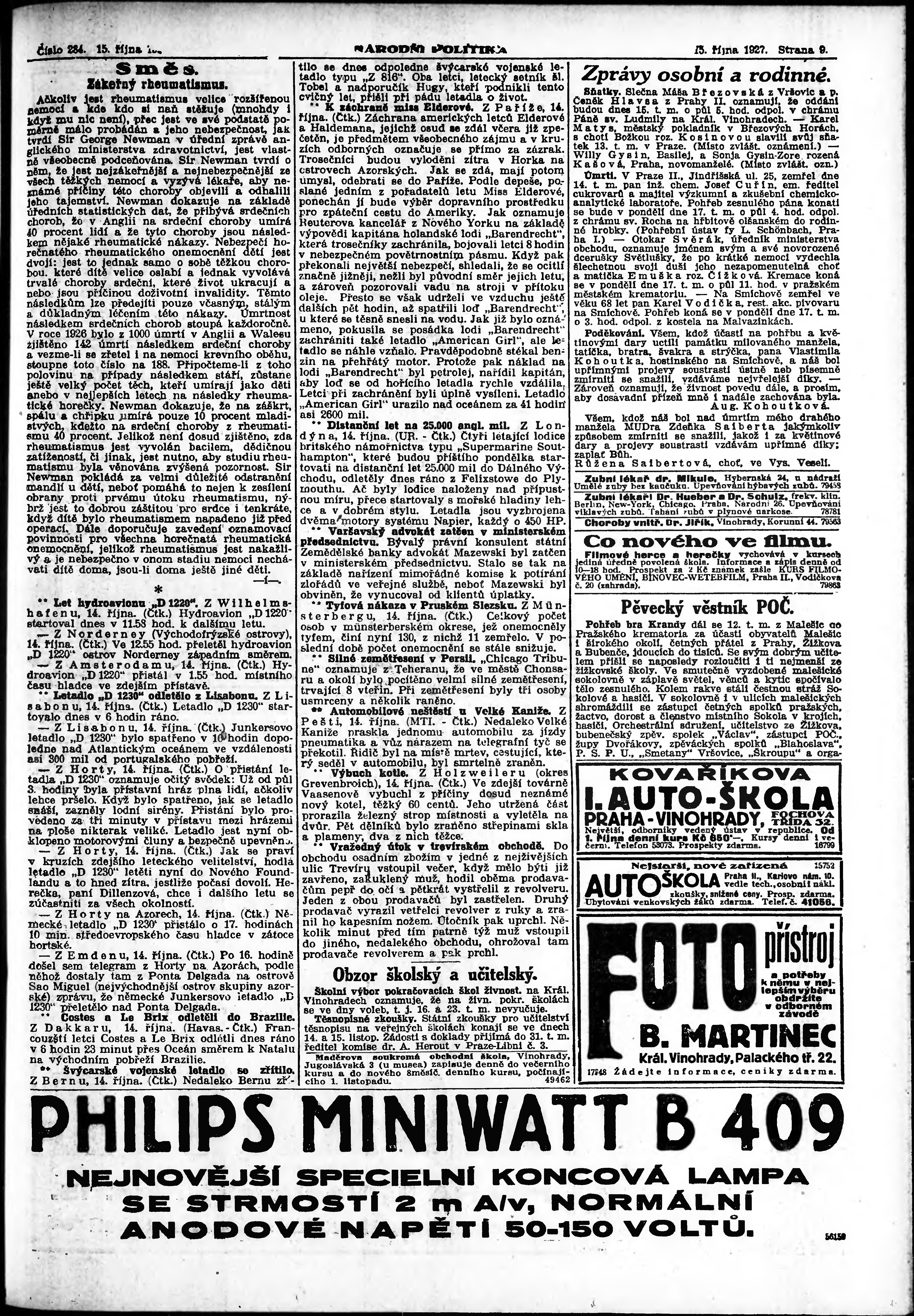 * Datum vydání výtisku: 15.10.1927 Číslo výtisku: 284 Poznámky k výtisku: ranní vydání; vydání pro Prahu;