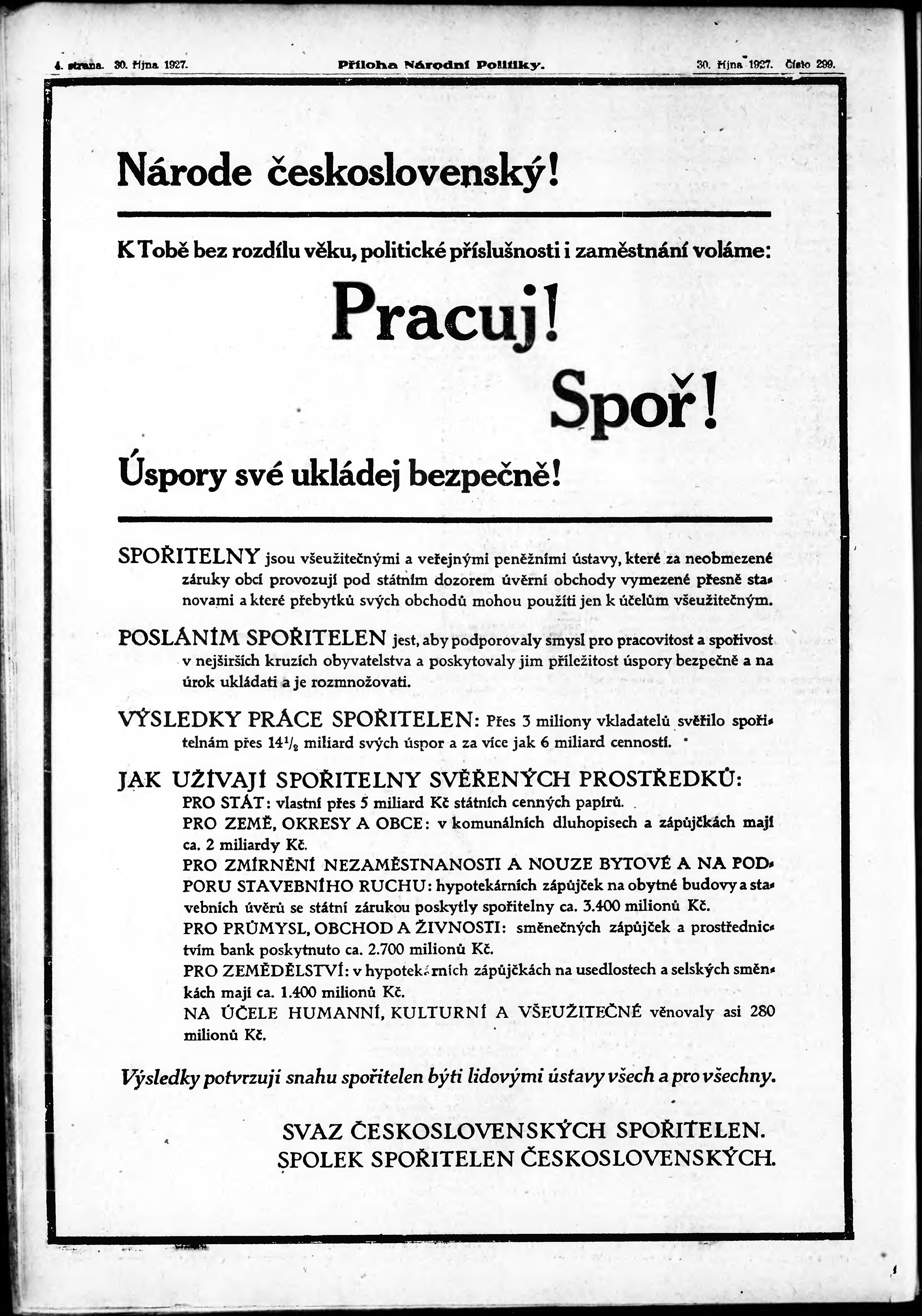 * Datum vydání výtisku: 30.10.1927 Číslo výtisku: 299 Typ výtisku: příloha Poznámky k výtisku: 1. příloha;