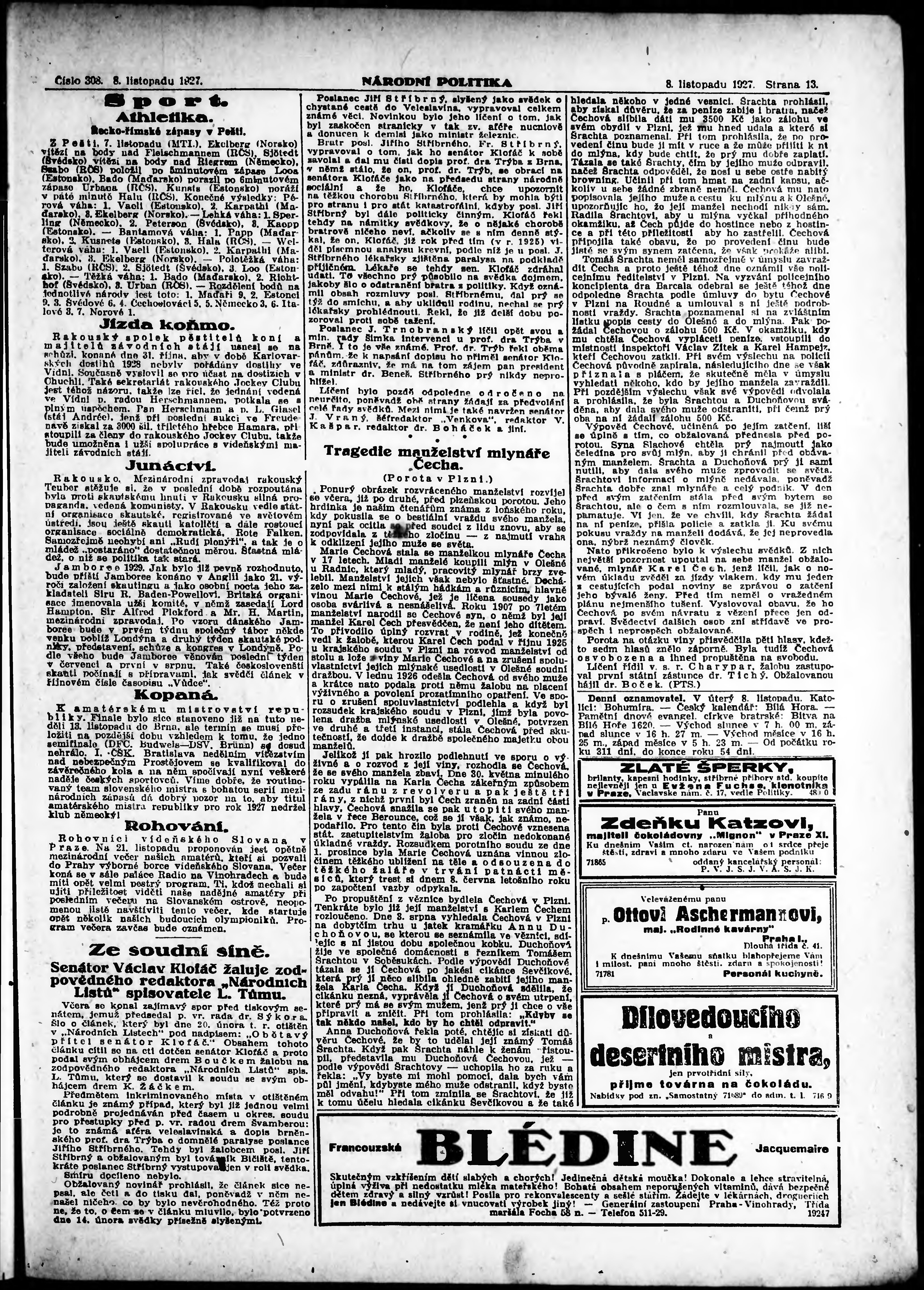 * Datum vydání výtisku: 8.11.1927 Číslo výtisku: 308 Poznámky k výtisku: ranní vydání; vydání pro Prahu;