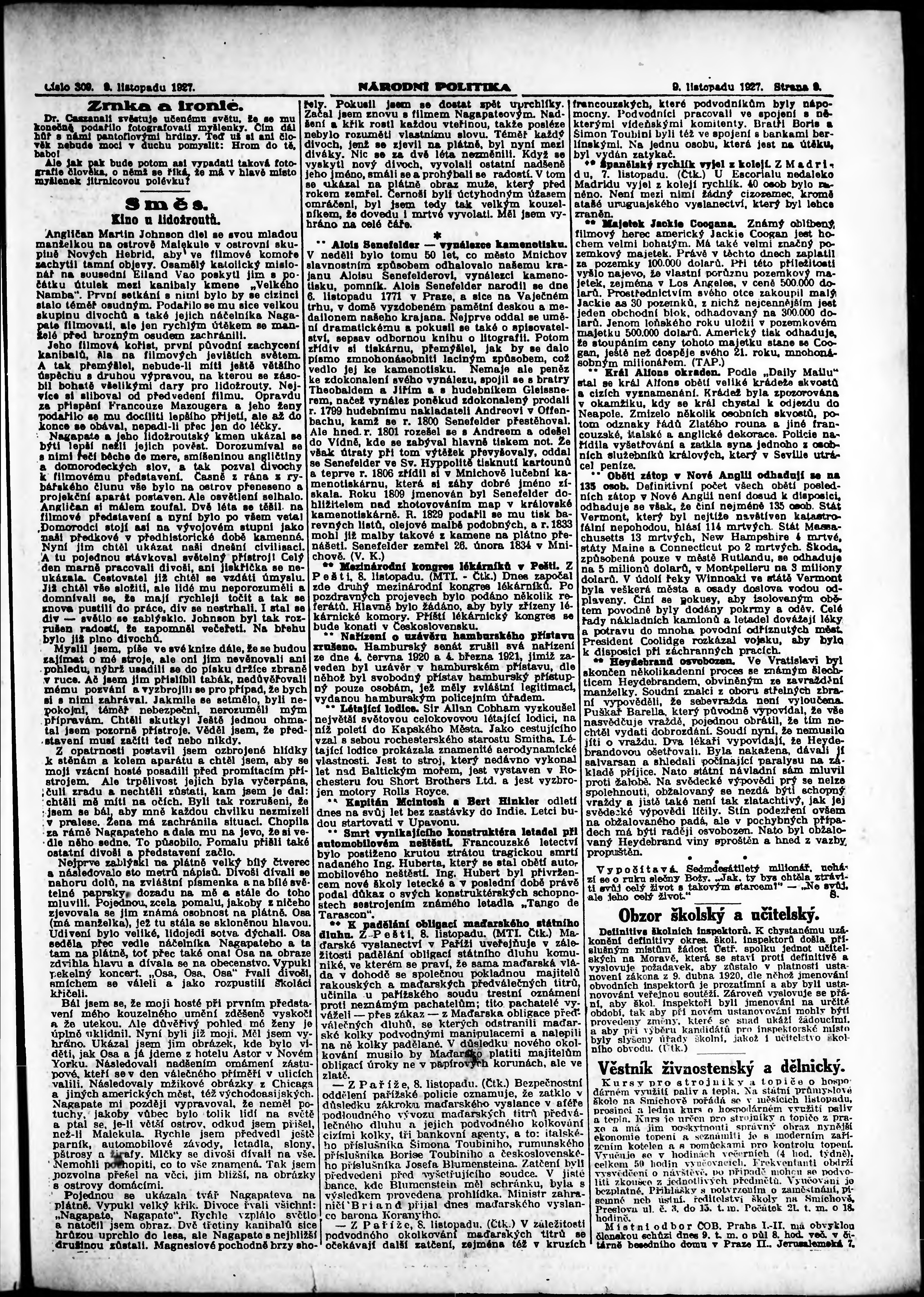 * Datum vydání výtisku: 9.11.1927 Číslo výtisku: 309 Poznámky k výtisku: ranní vydání; vydání pro Prahu;