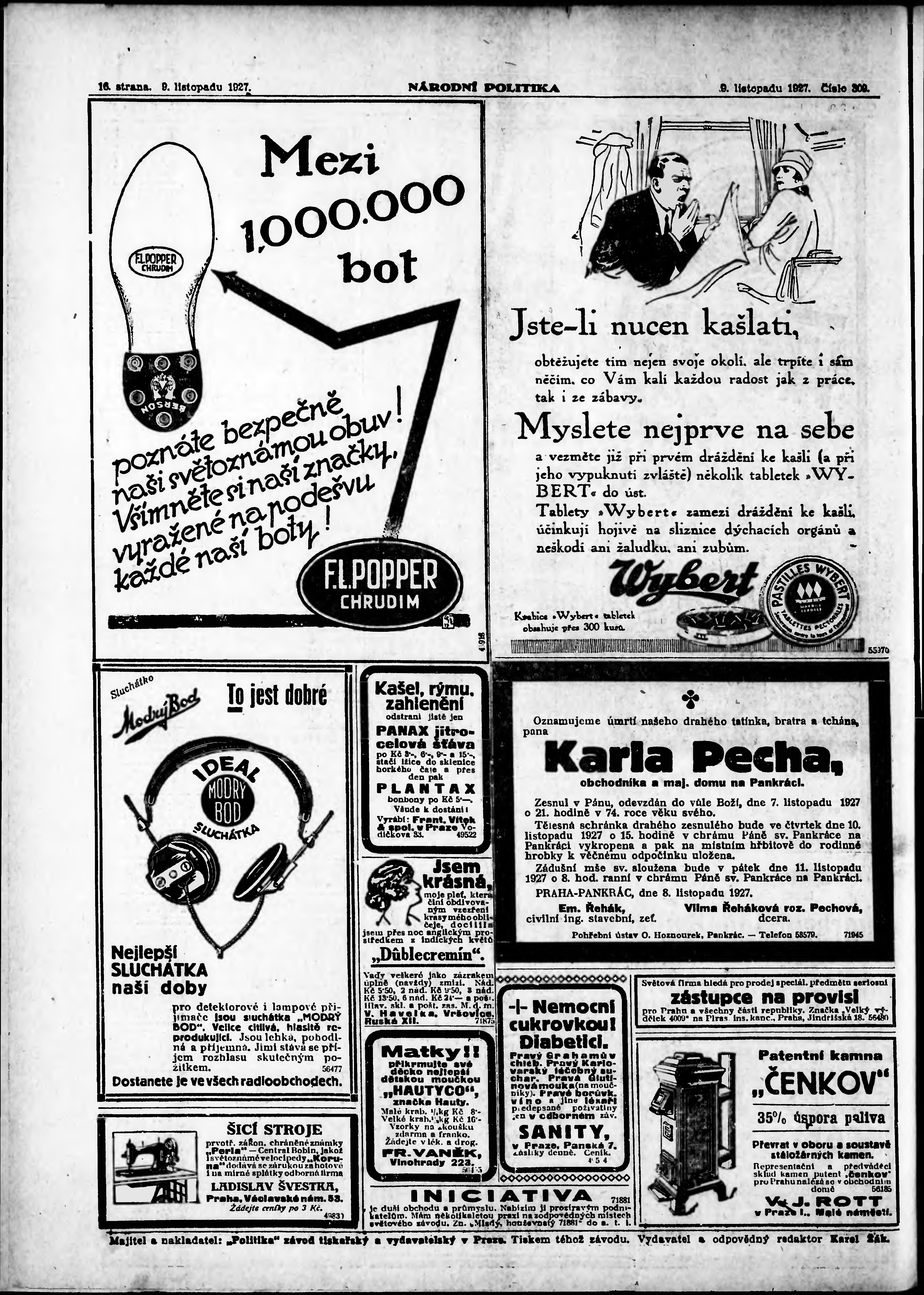 * Datum vydání výtisku: 9.11.1927 Číslo výtisku: 309 Poznámky k výtisku: ranní vydání; vydání pro Prahu;