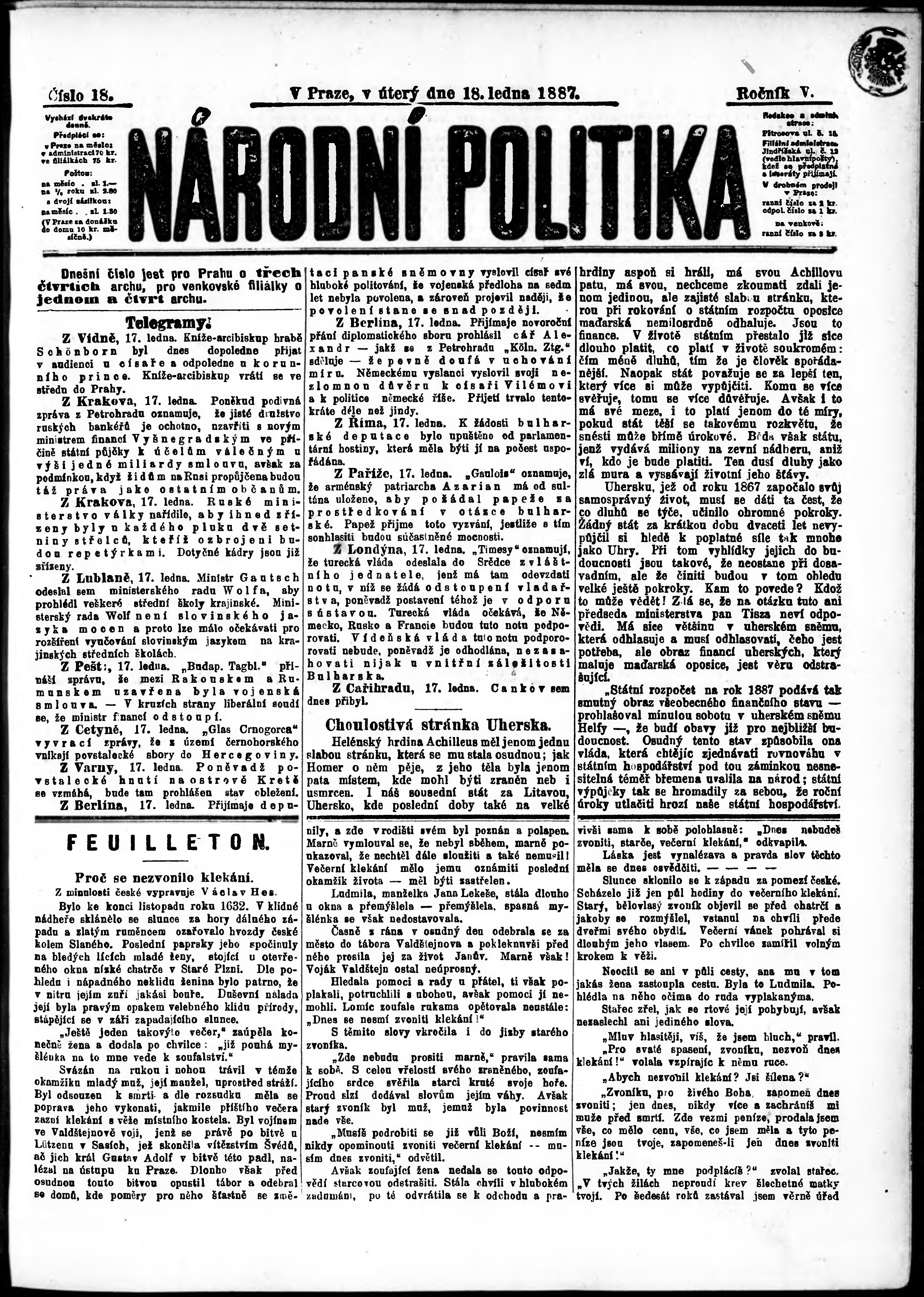 * Datum vydání výtisku: 18.1.1887 Číslo výtisku: 18 Poznámky k výtisku: ranní vydání;