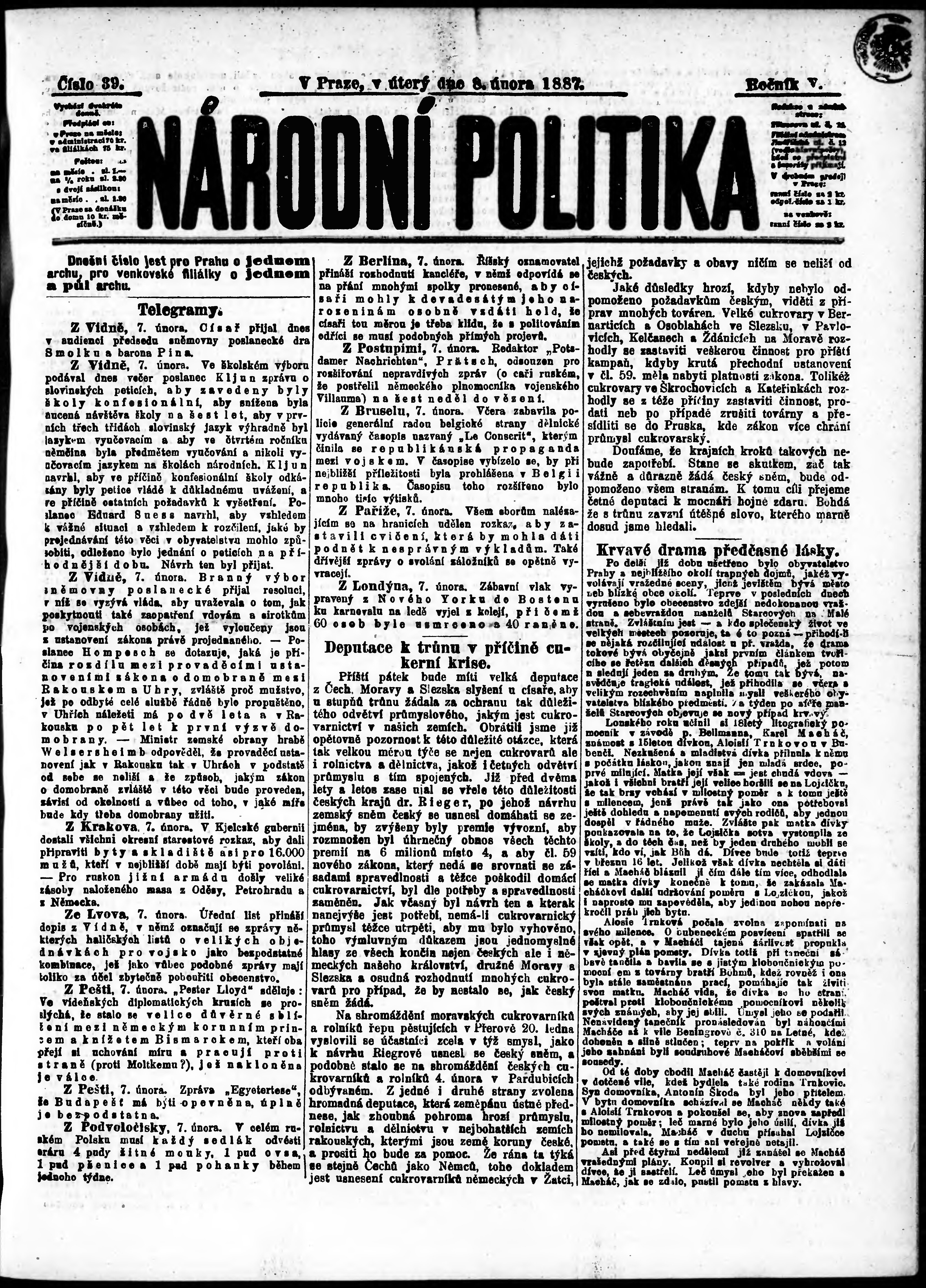 * Datum vydání výtisku: 8.2.1887 Číslo výtisku: 39 Poznámky k výtisku: ranní vydání;