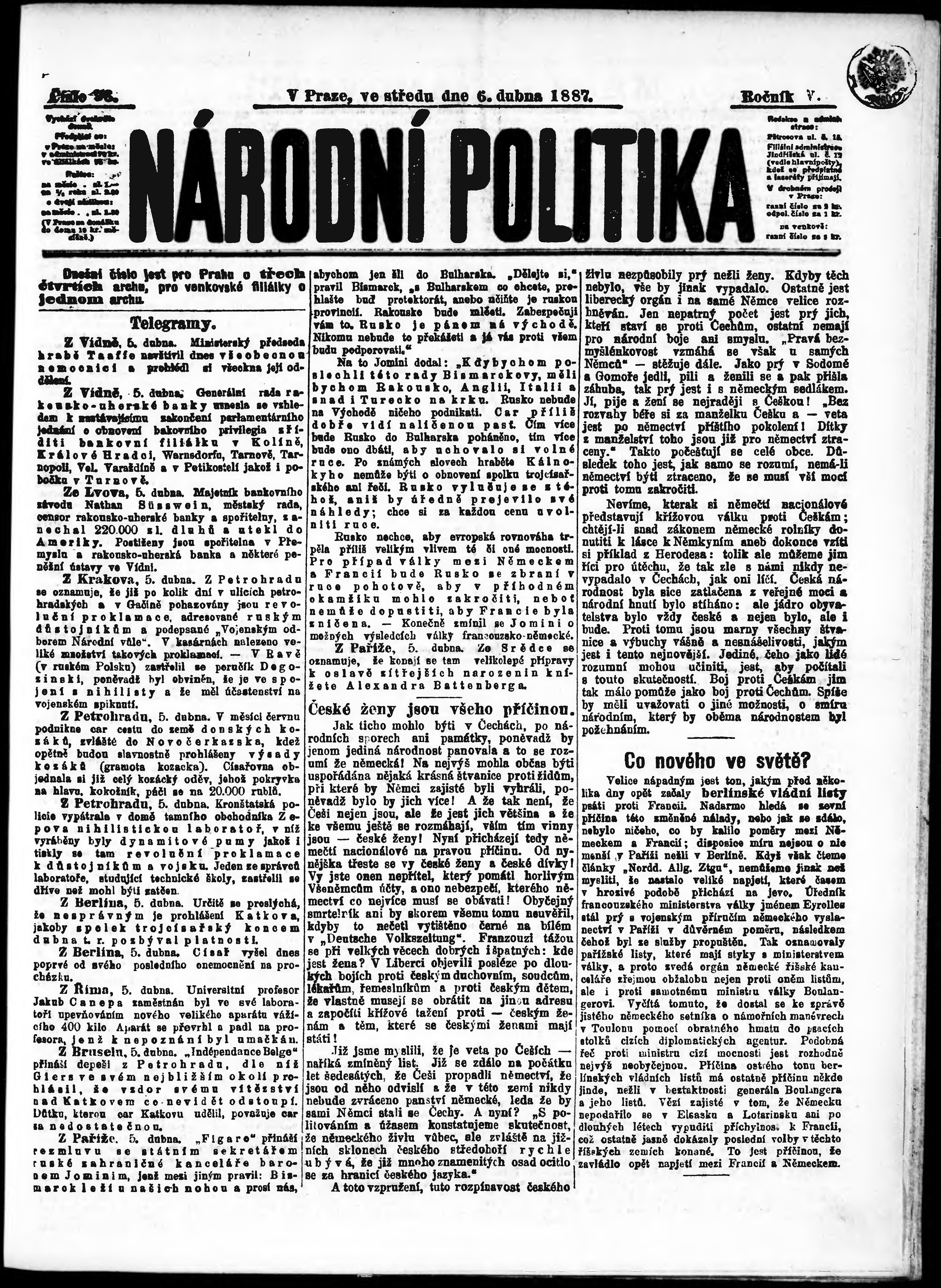 * Datum vydání výtisku: 6.4.1887 Číslo výtisku: 96 Poznámky k výtisku: ranní vydání;
