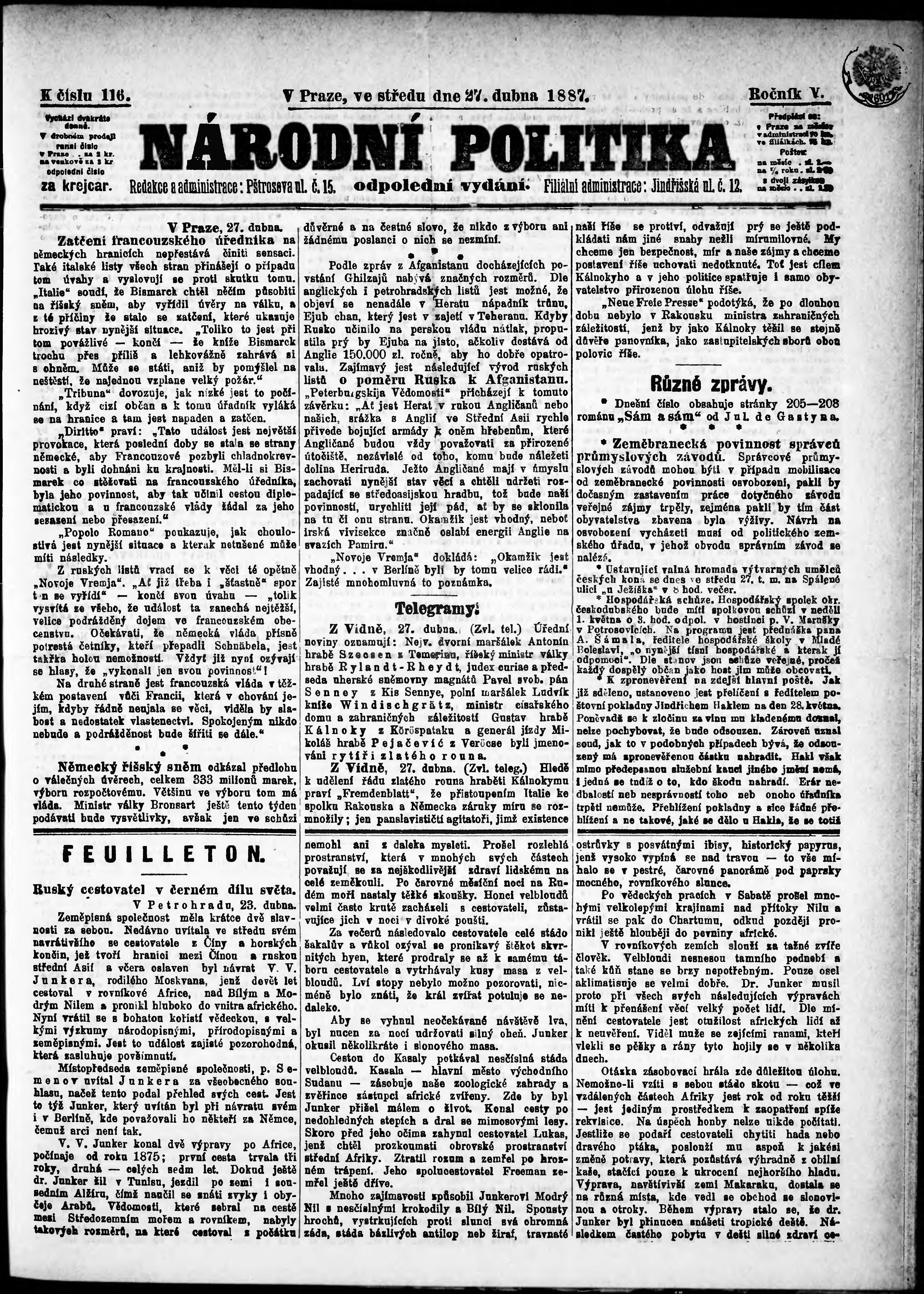 * Datum vydání výtisku: 27.4.1887 Číslo výtisku: 116 Poznámky k výtisku: odpolední vydání;