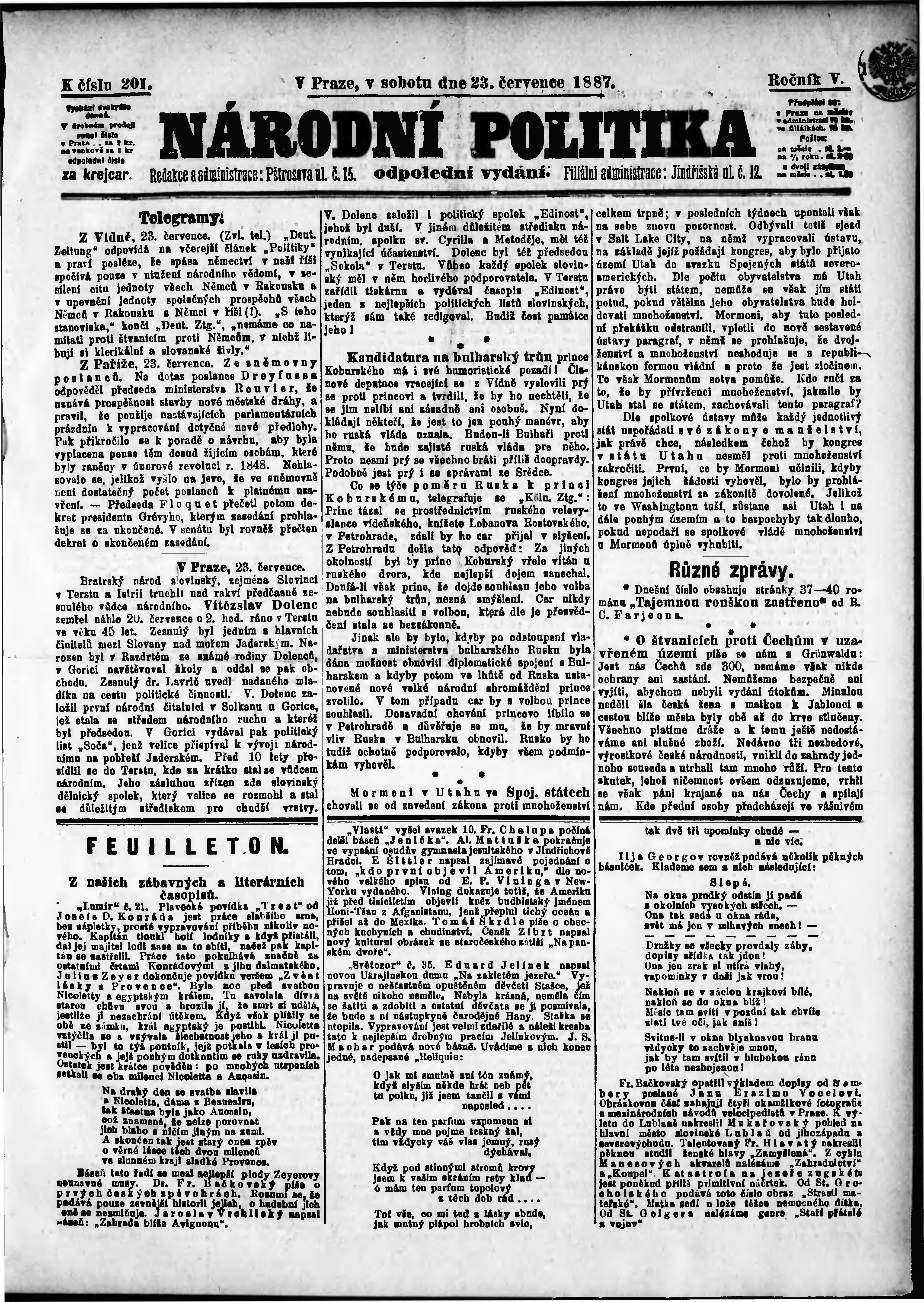 * Datum vydání výtisku: 23.7.1887 Číslo výtisku: 201 Poznámky k výtisku: odpolední vydání;