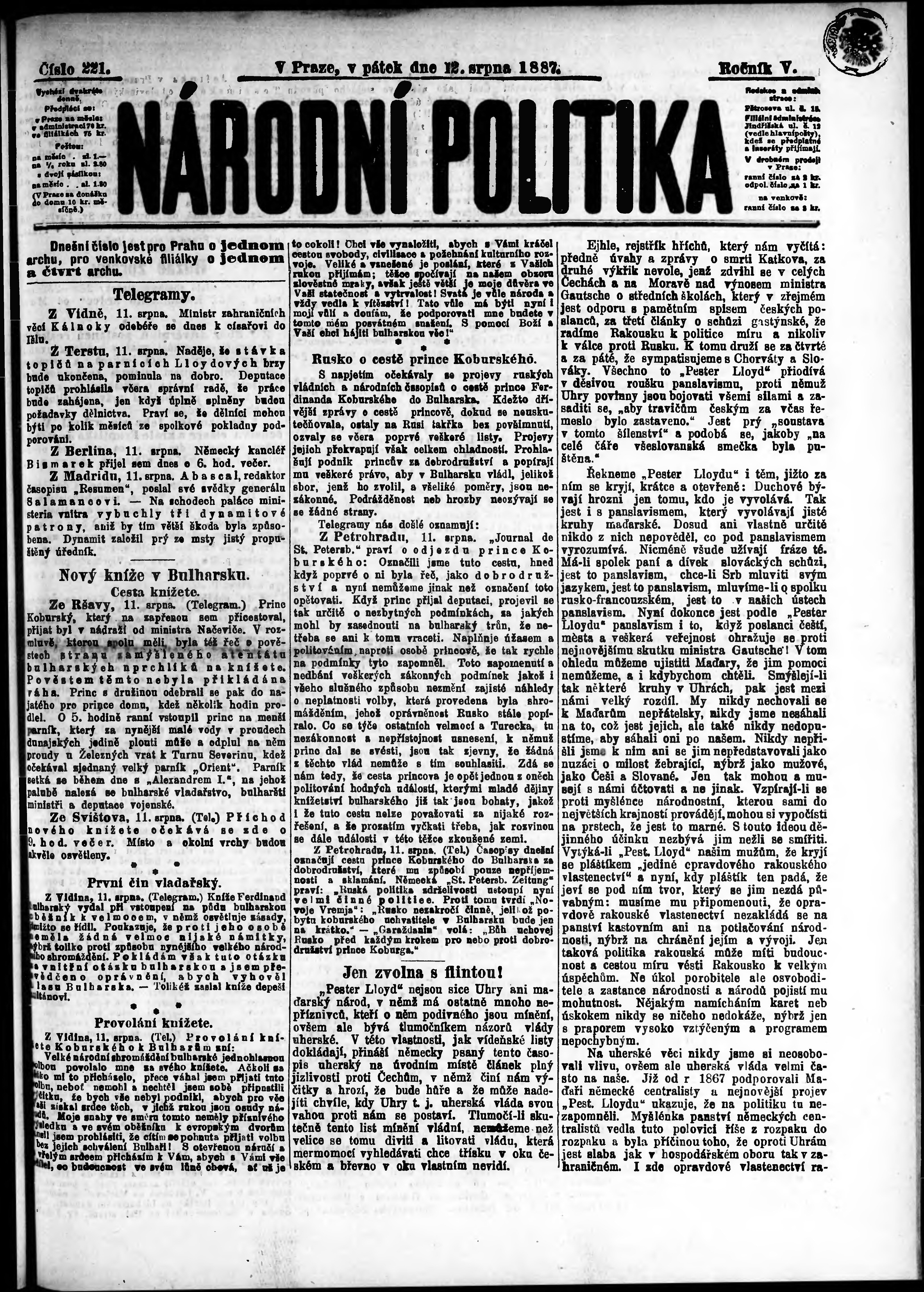 * Datum vydání výtisku: 12.8.1887 Číslo výtisku: 221 Poznámky k výtisku: ranní vydání;