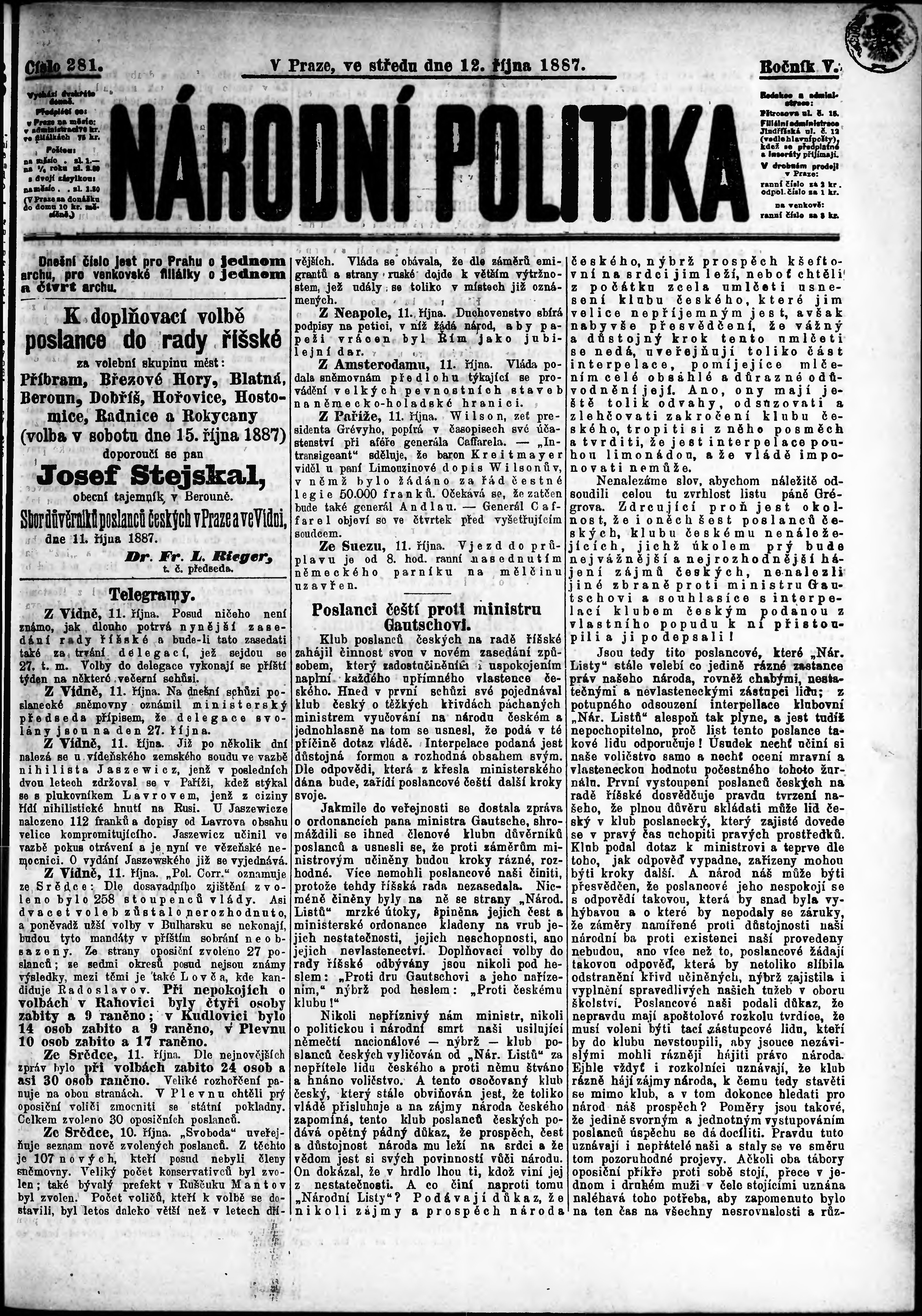* Datum vydání výtisku: 12.10.1887 Číslo výtisku: 281 Poznámky k výtisku: ranní vydání;