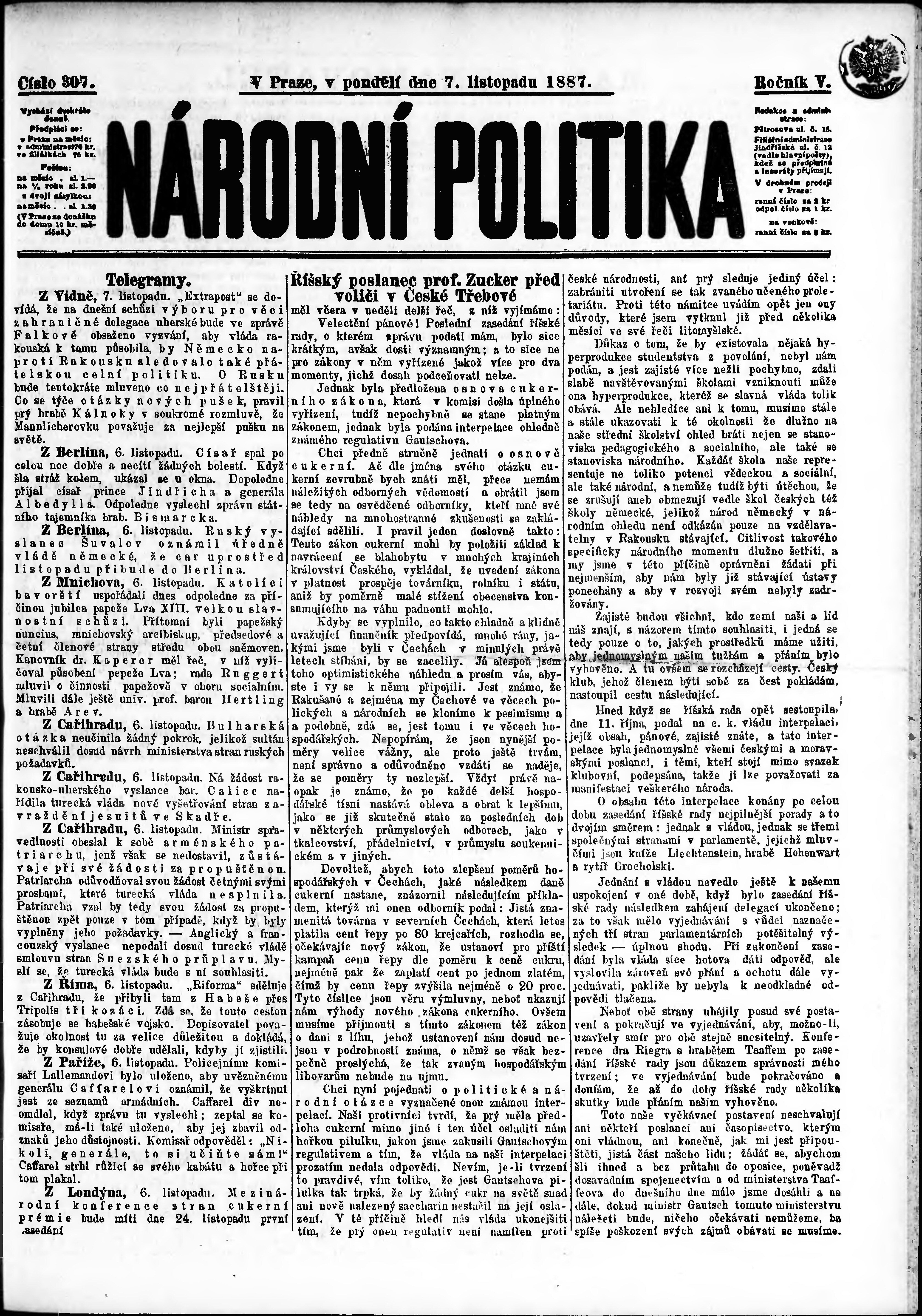 * Datum vydání výtisku: 7.11.1887 Číslo výtisku: 307 Poznámky k výtisku: ranní vydání;