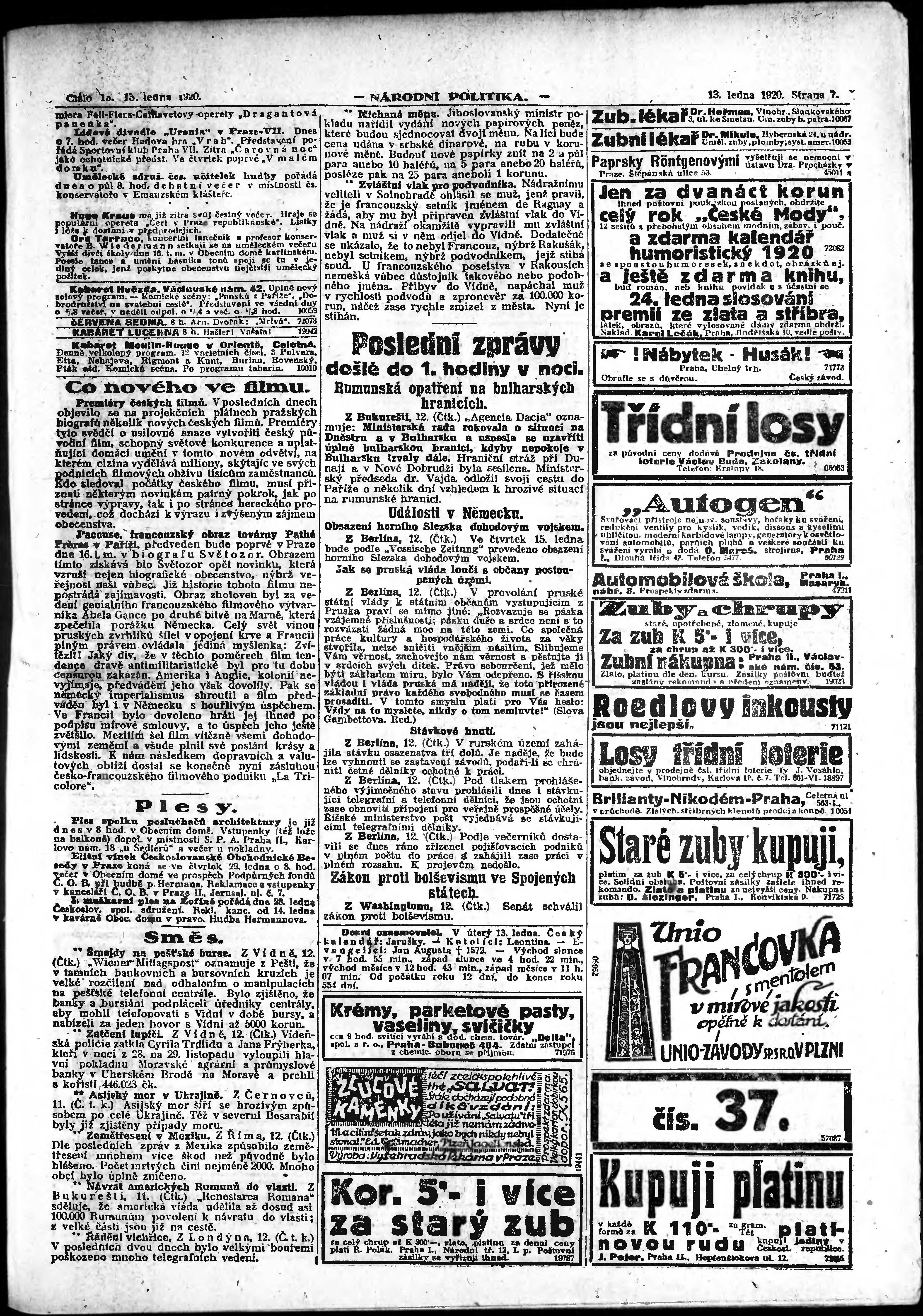 * Datum vydání výtisku: 13.1.1920 Číslo výtisku: 13 Poznámky k výtisku: ranní vydání; vydání pro Prahu;