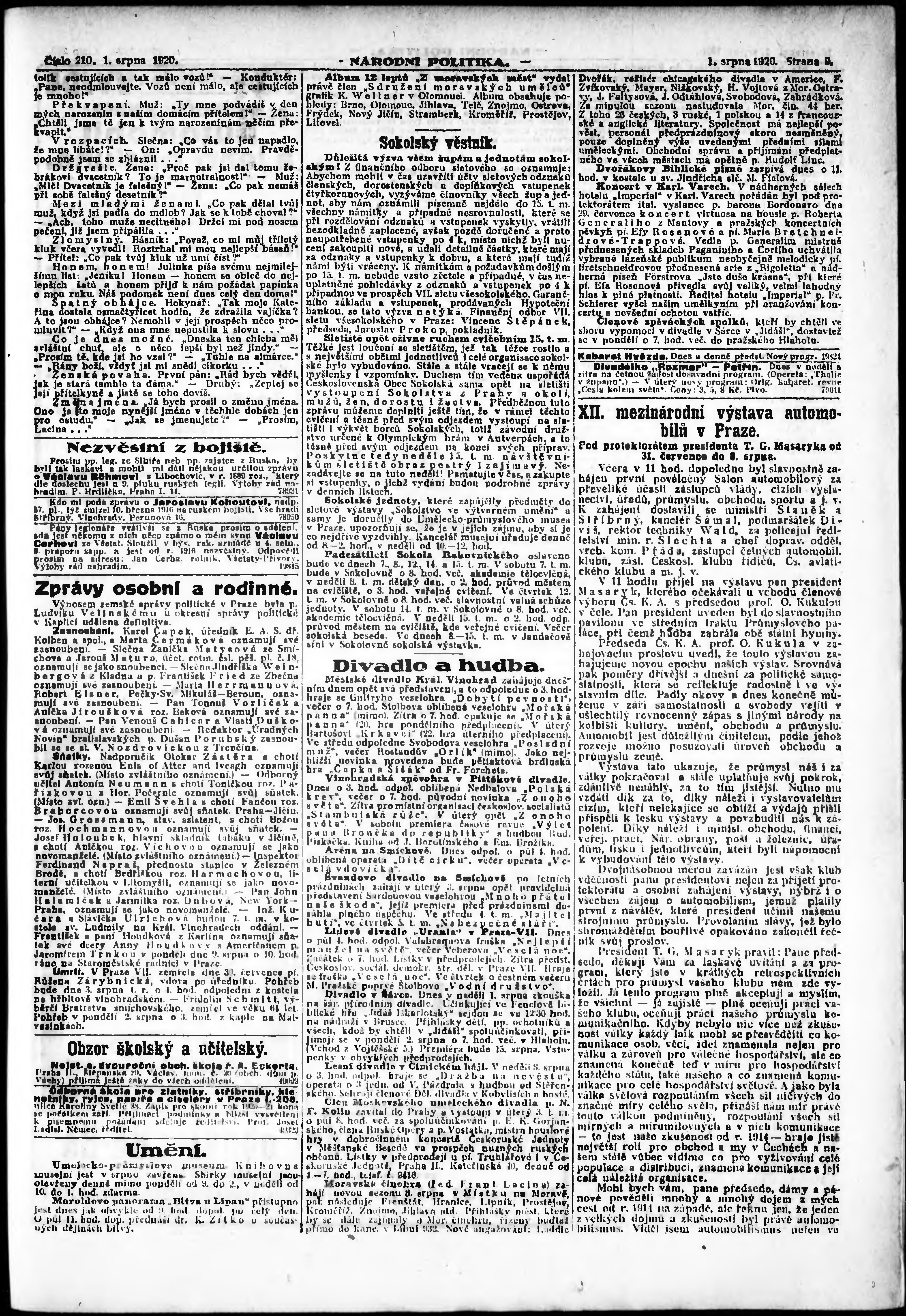 * Datum vydání výtisku: 1.8.1920 Číslo výtisku: 210 Poznámky k výtisku: ranní vydání;