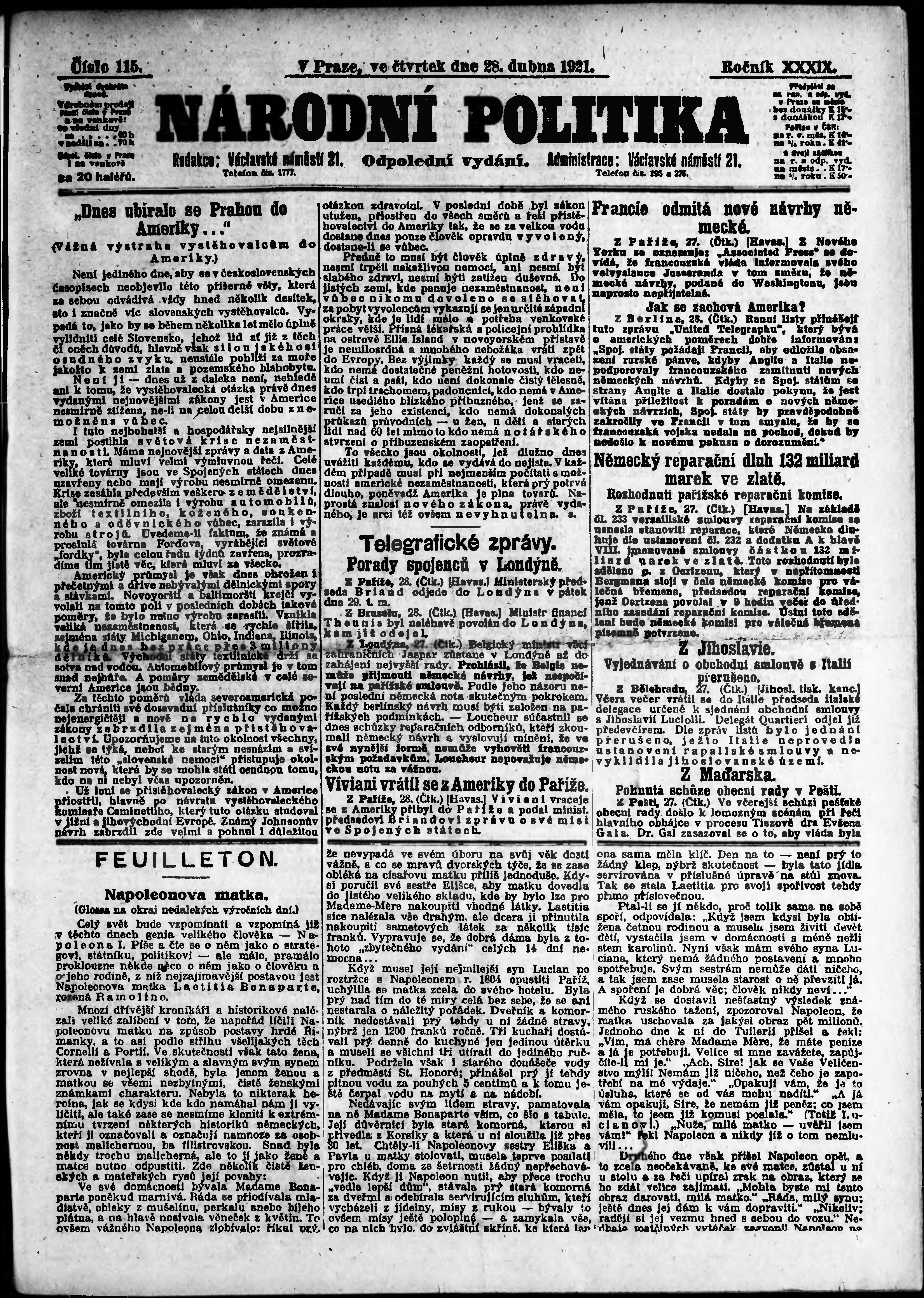 * Datum vydání výtisku: 28.4.1921 Číslo výtisku: 115 Poznámky k výtisku: odpolední vydání;