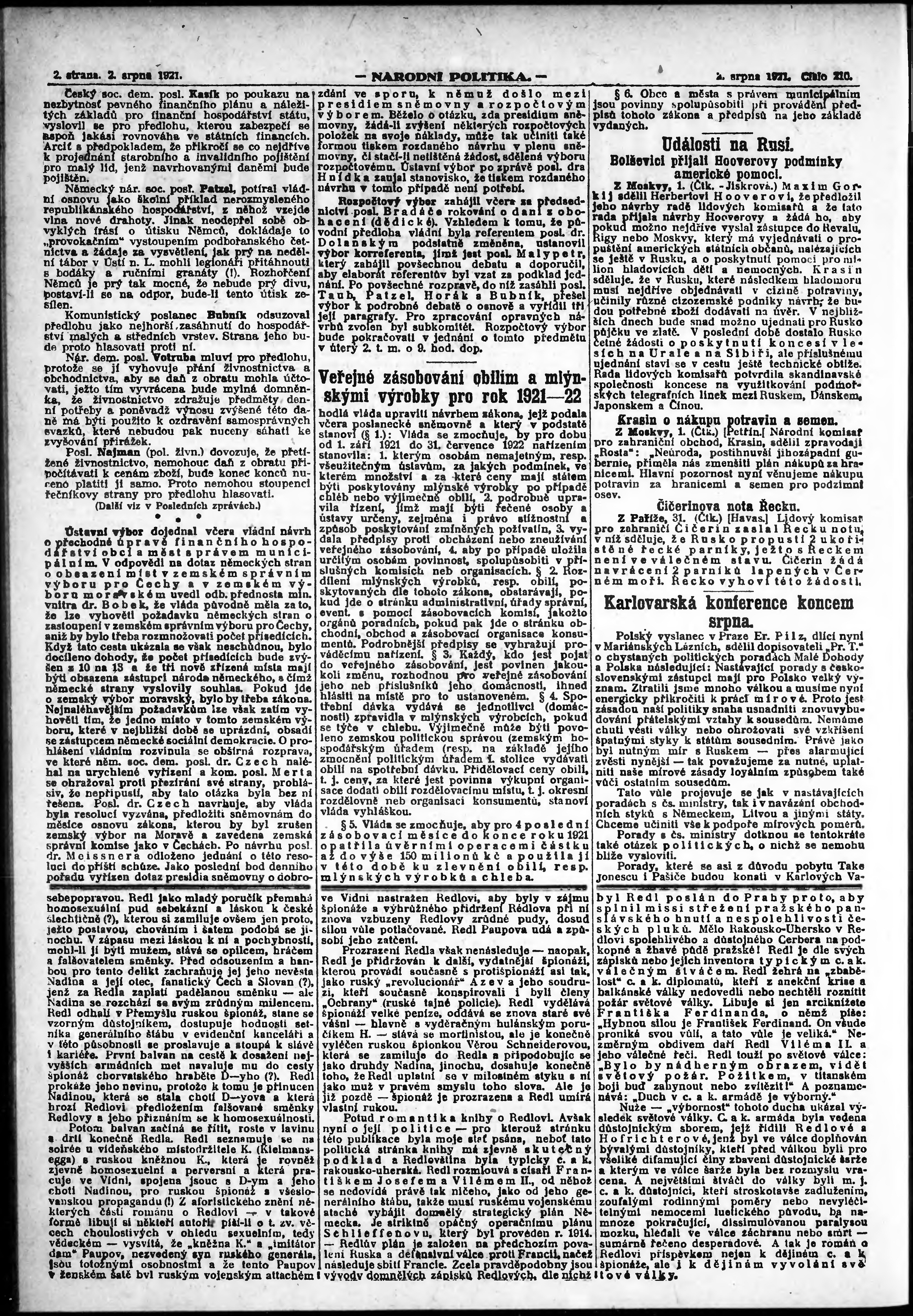 * Datum vydání výtisku: 2.8.1921 Číslo výtisku: 210 Poznámky k výtisku: ranní vydání; vydání pro Prahu;