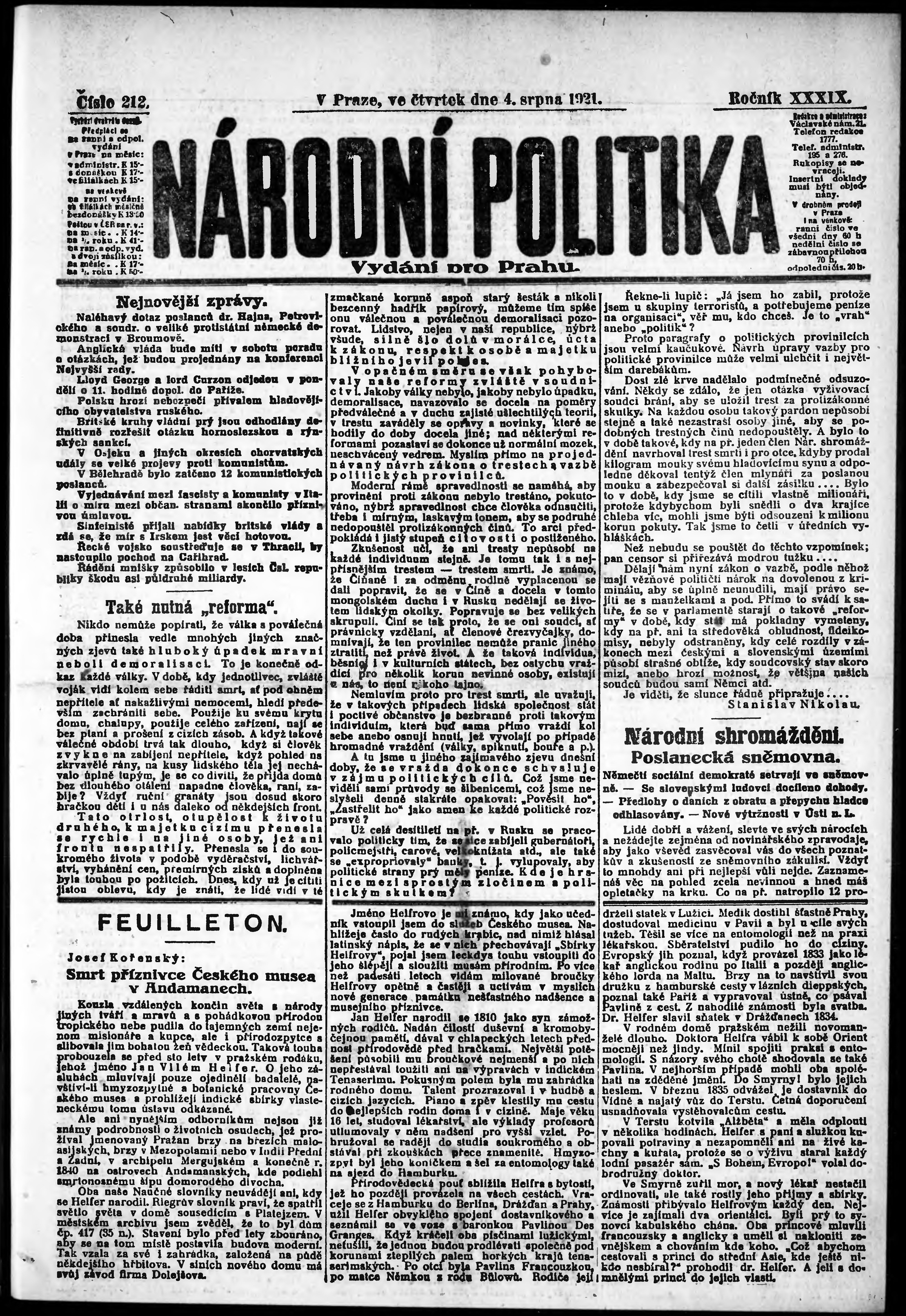 * Datum vydání výtisku: 4.8.1921 Číslo výtisku: 212 Poznámky k výtisku: ranní vydání; vydání pro Prahu;