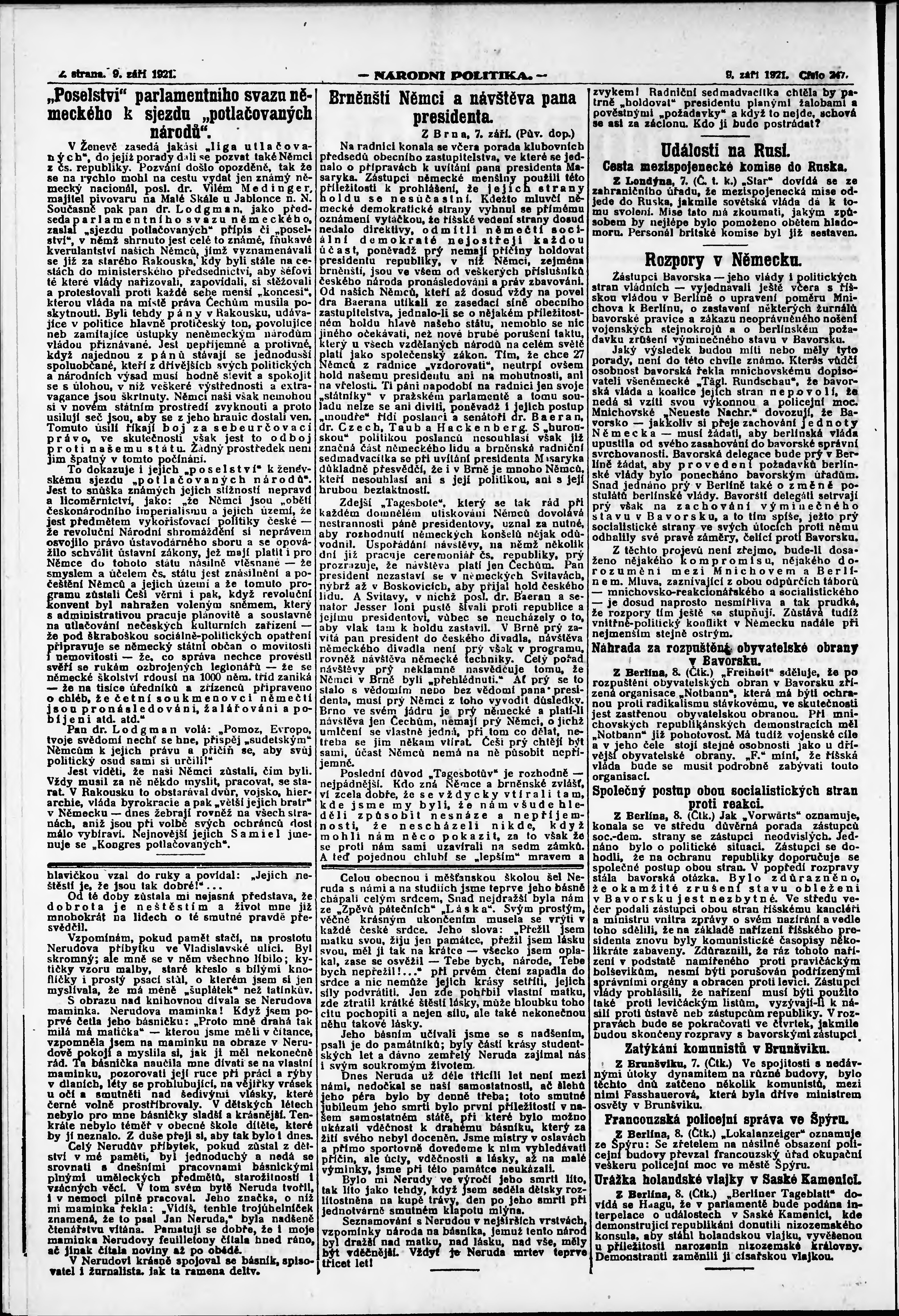 * Datum vydání výtisku: 9.9.1921 Číslo výtisku: 247 Poznámky k výtisku: ranní vydání; vydání pro Prahu;