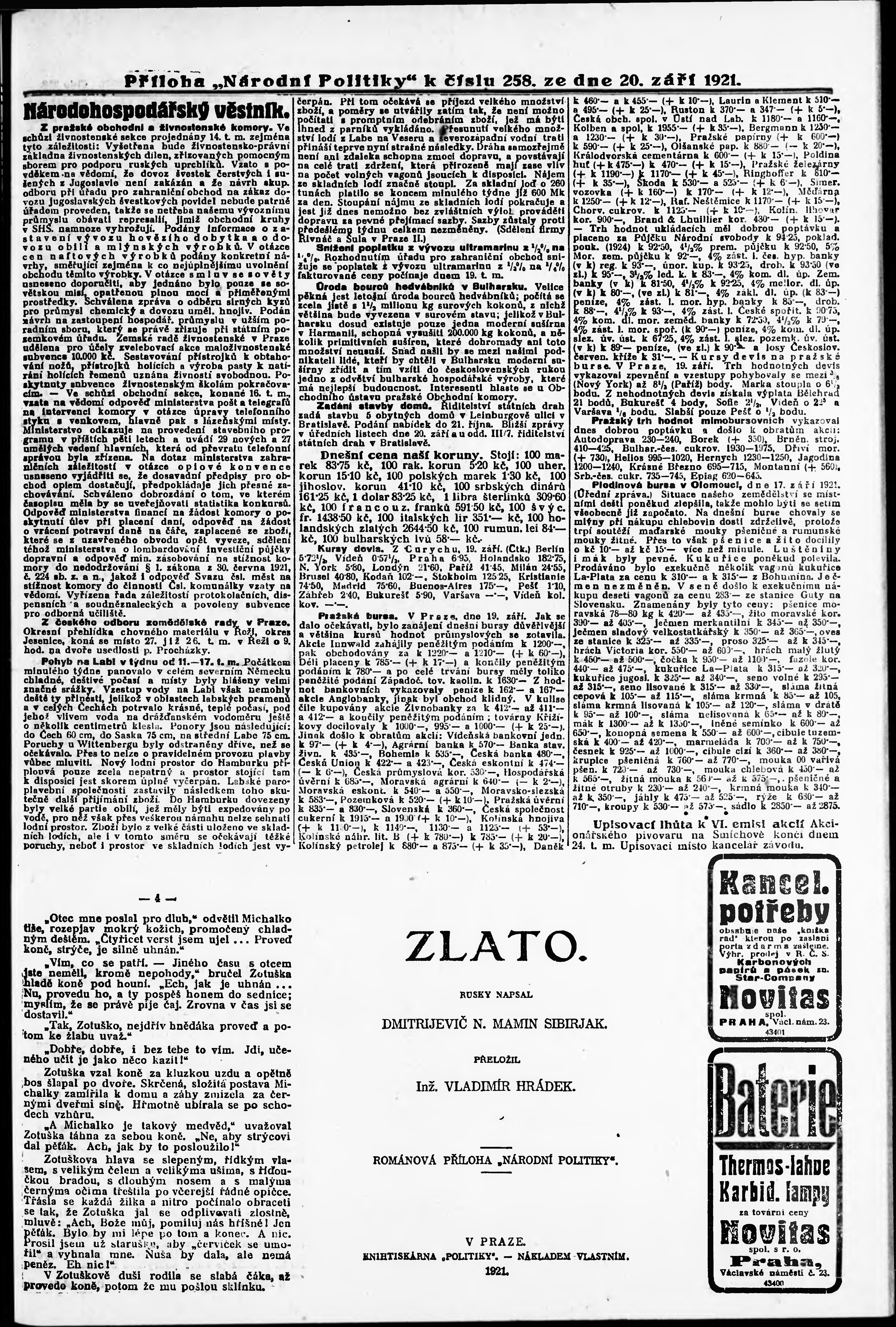 * Datum vydání výtisku: 20.9.1921 Číslo výtisku: 258 Typ výtisku: příloha
