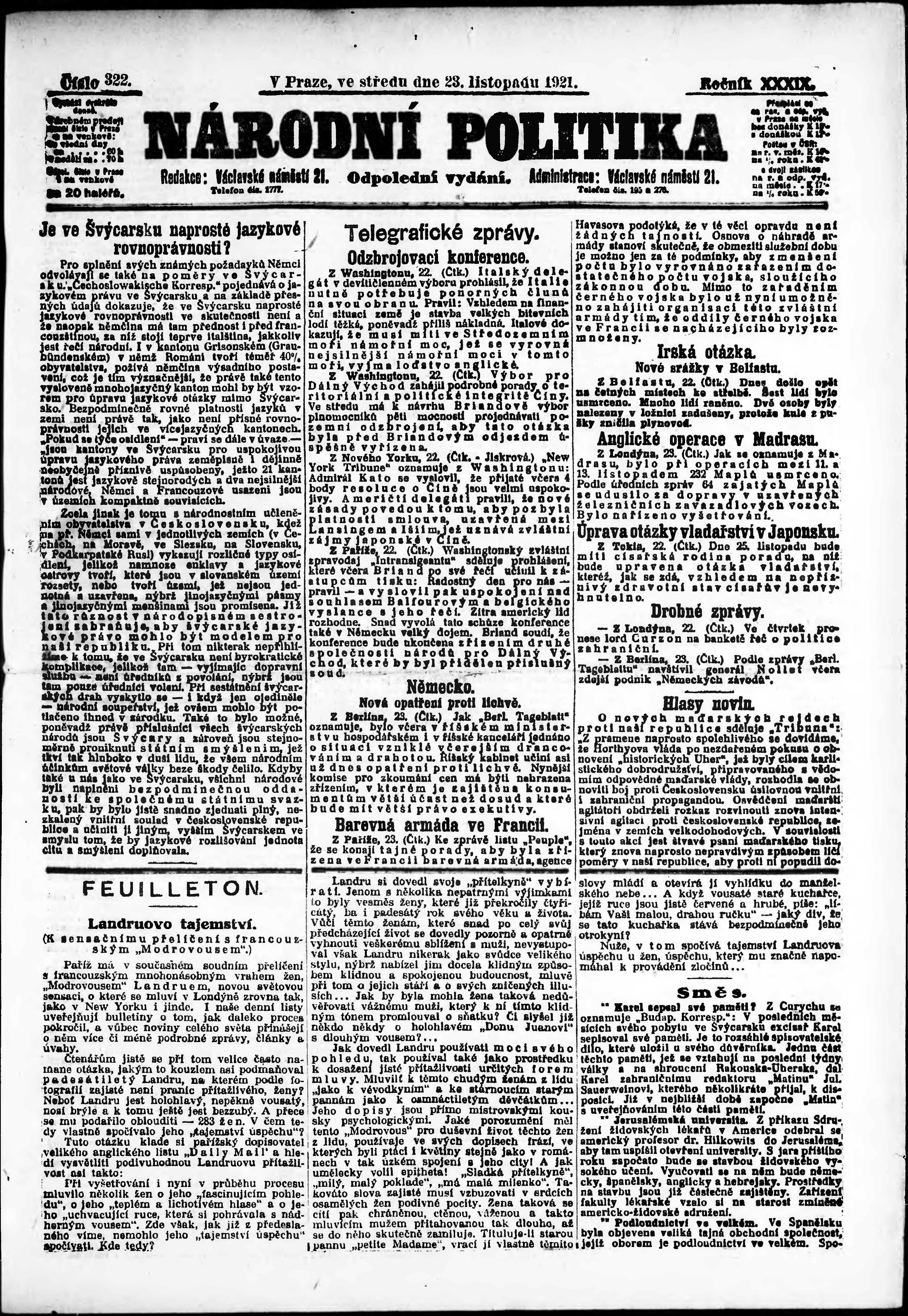* Datum vydání výtisku: 23.11.1921 Číslo výtisku: 322 Poznámky k výtisku: odpolední vydání;