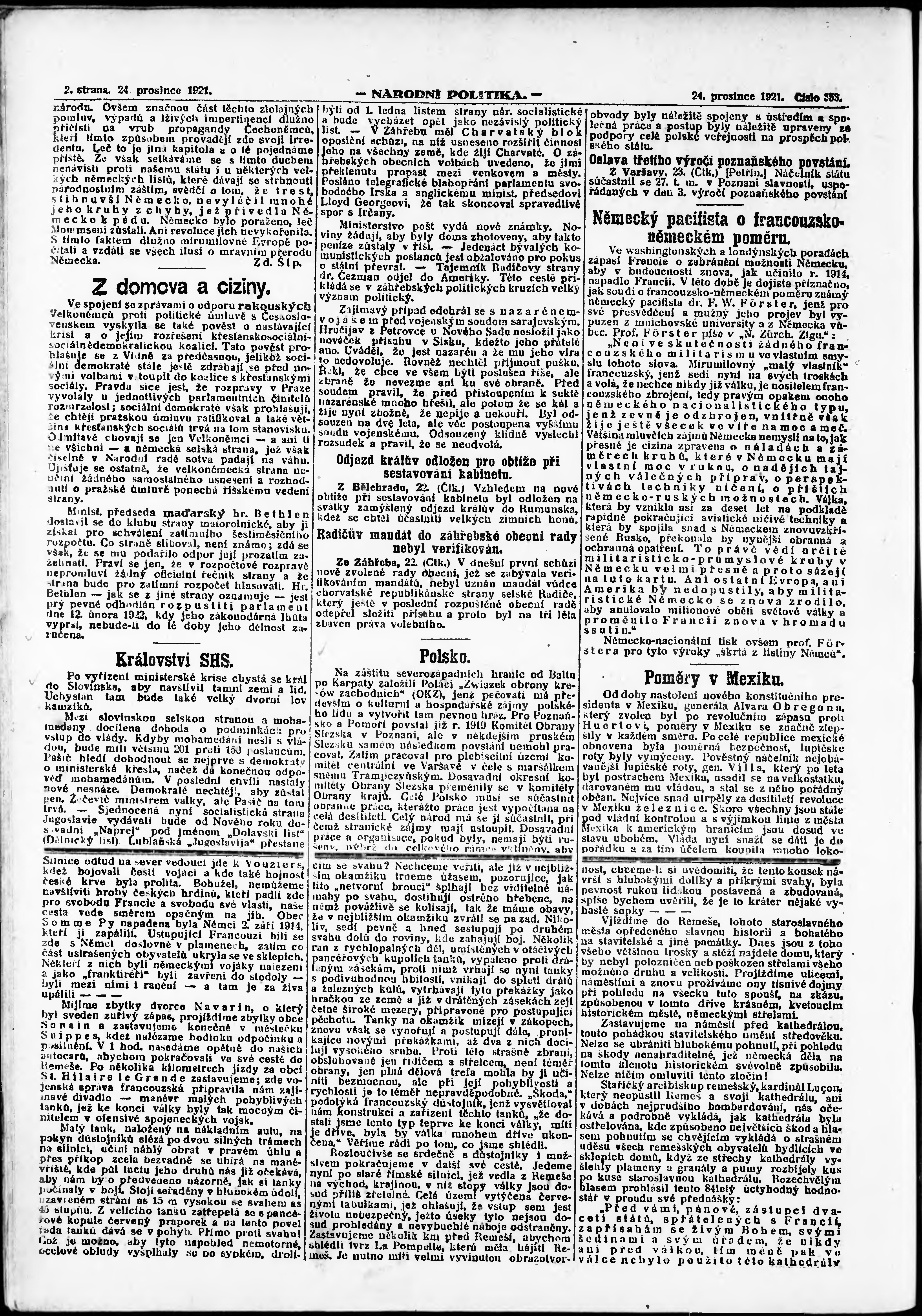 * Datum vydání výtisku: 24.12.1921 Číslo výtisku: 353 Poznámky k výtisku: ranní vydání; vydání pro Prahu;
