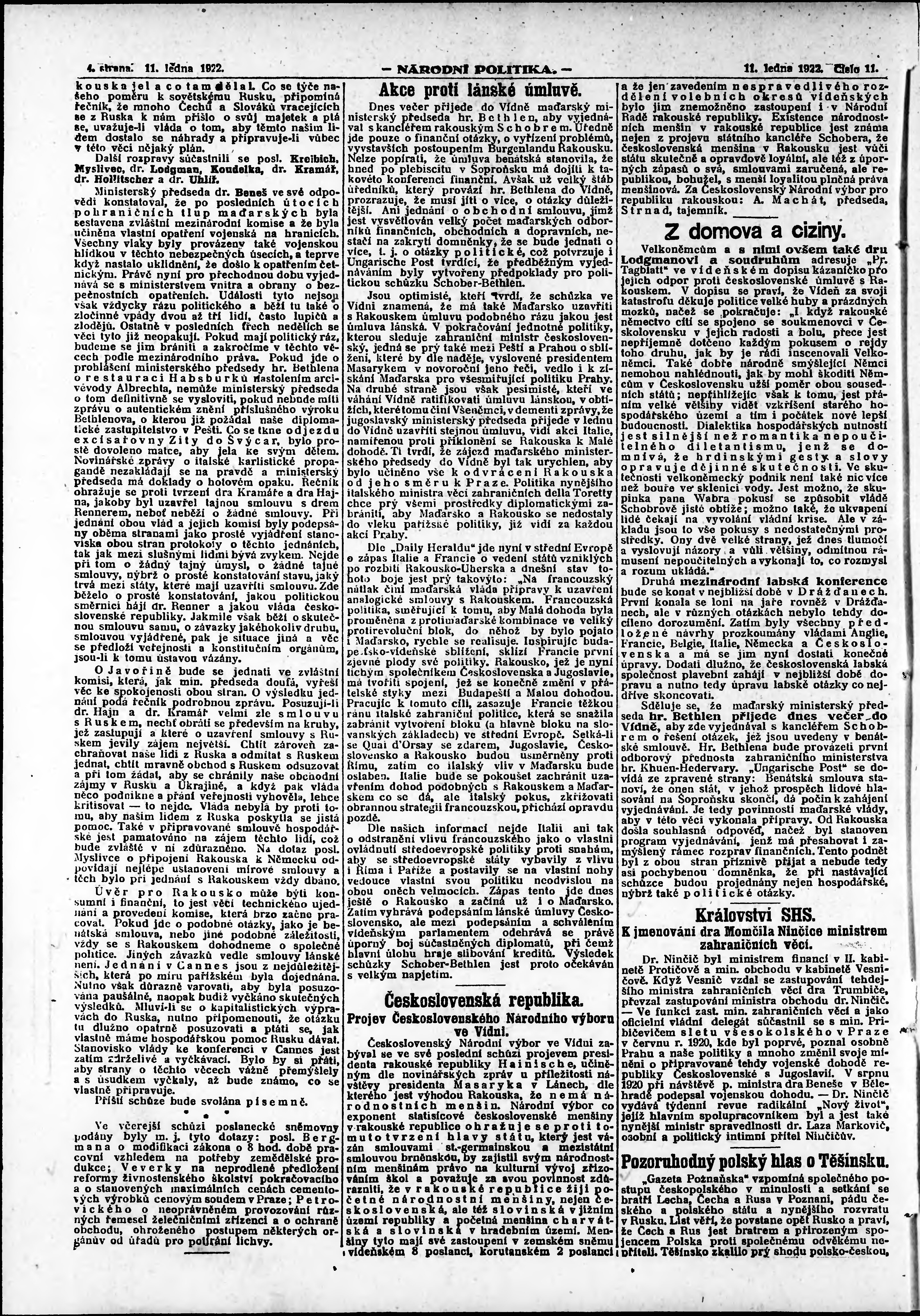 * Datum vydání výtisku: 11.1.1922 Číslo výtisku: 11 Poznámky k výtisku: ranní vydání; vydání pro Prahu;