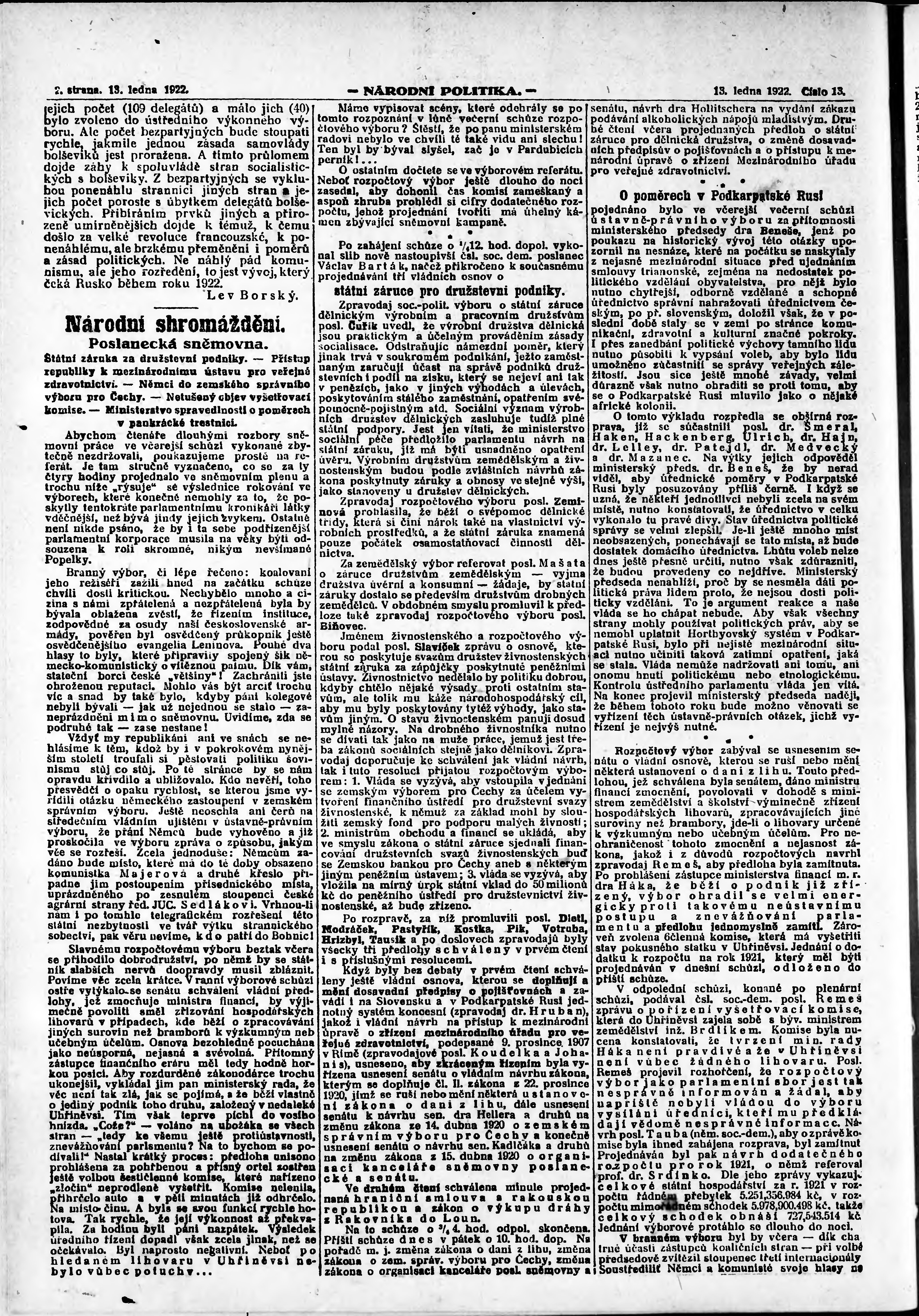 * Datum vydání výtisku: 13.1.1922 Číslo výtisku: 13 Poznámky k výtisku: ranní vydání; vydání pro Prahu; od s. 9 není k dispozici;