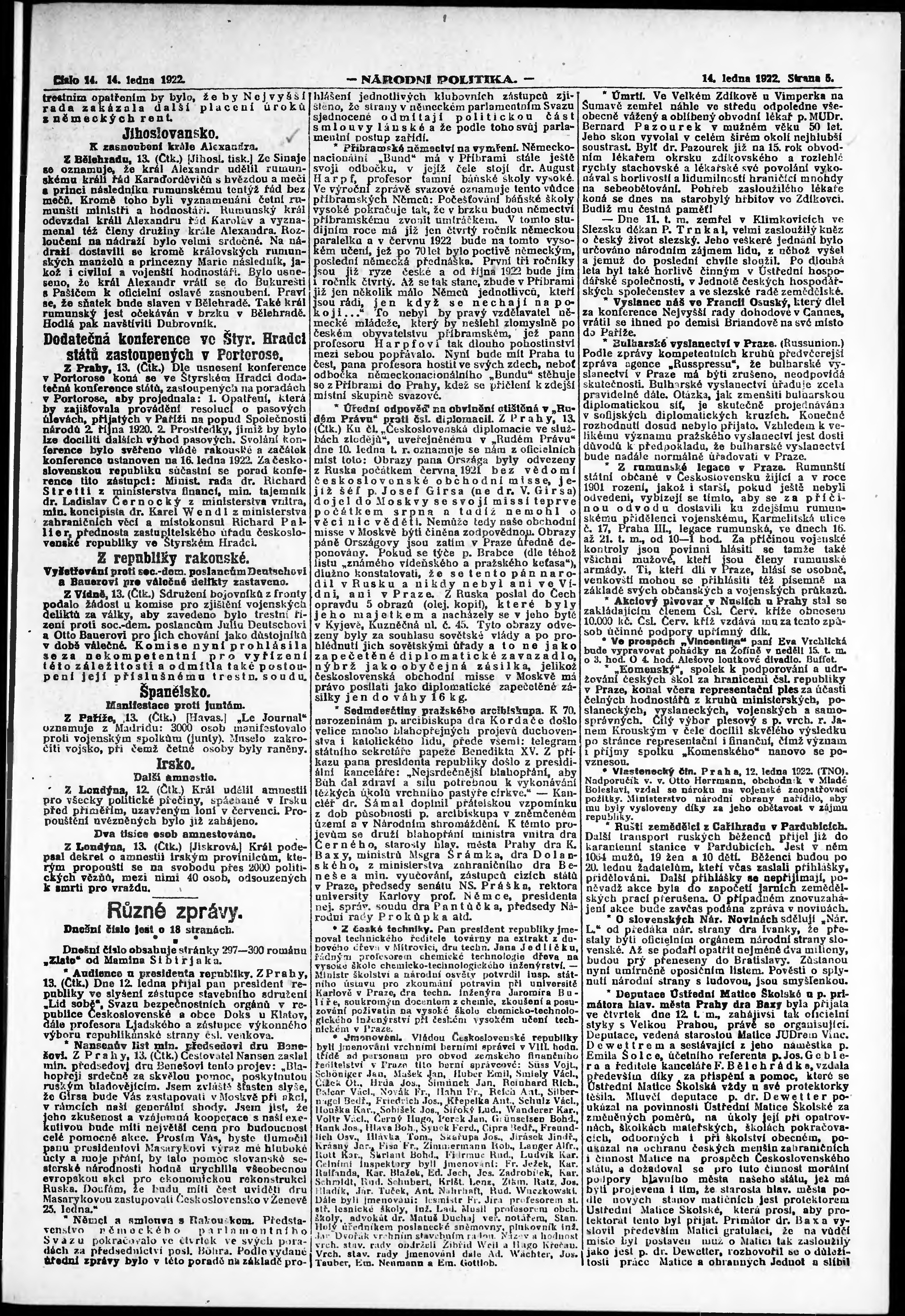 * Datum vydání výtisku: 14.1.1922 Číslo výtisku: 14 Poznámky k výtisku: ranní vydání; vydání pro Prahu;