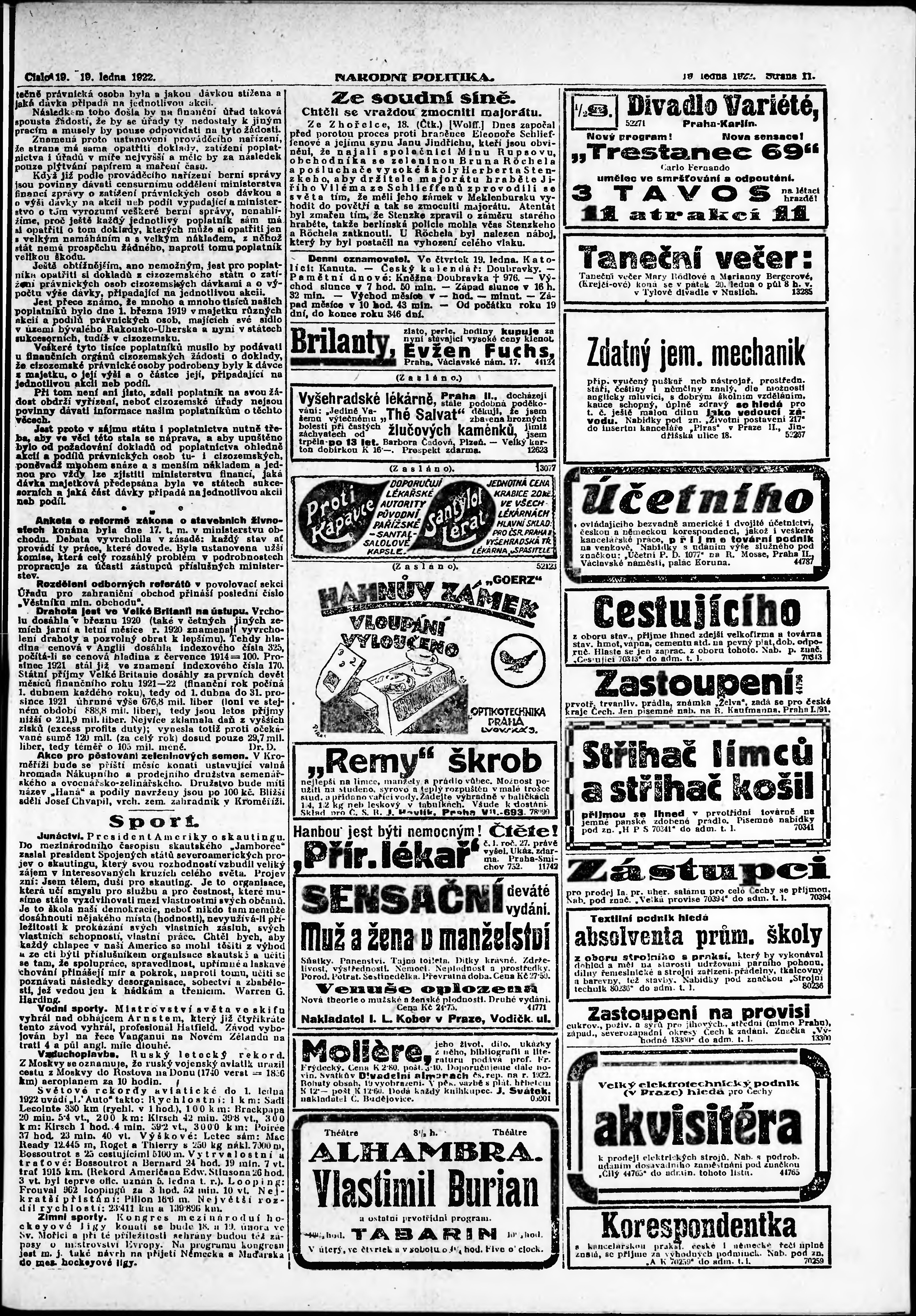 * Datum vydání výtisku: 19.1.1922 Číslo výtisku: 19 Poznámky k výtisku: ranní vydání; vydání pro Prahu;