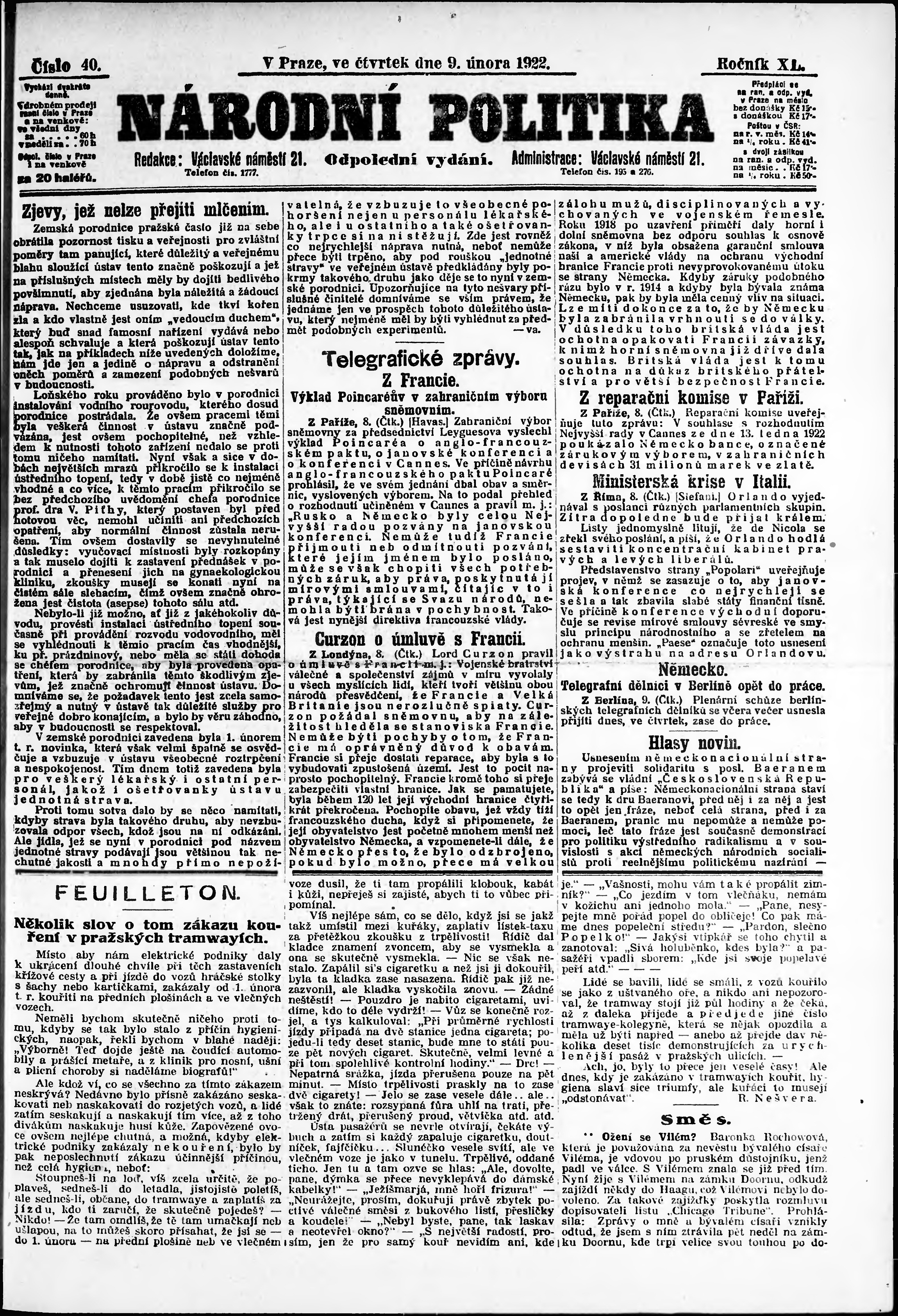 * Datum vydání výtisku: 9.2.1922 Číslo výtisku: 40 Poznámky k výtisku: odpolední vydání;