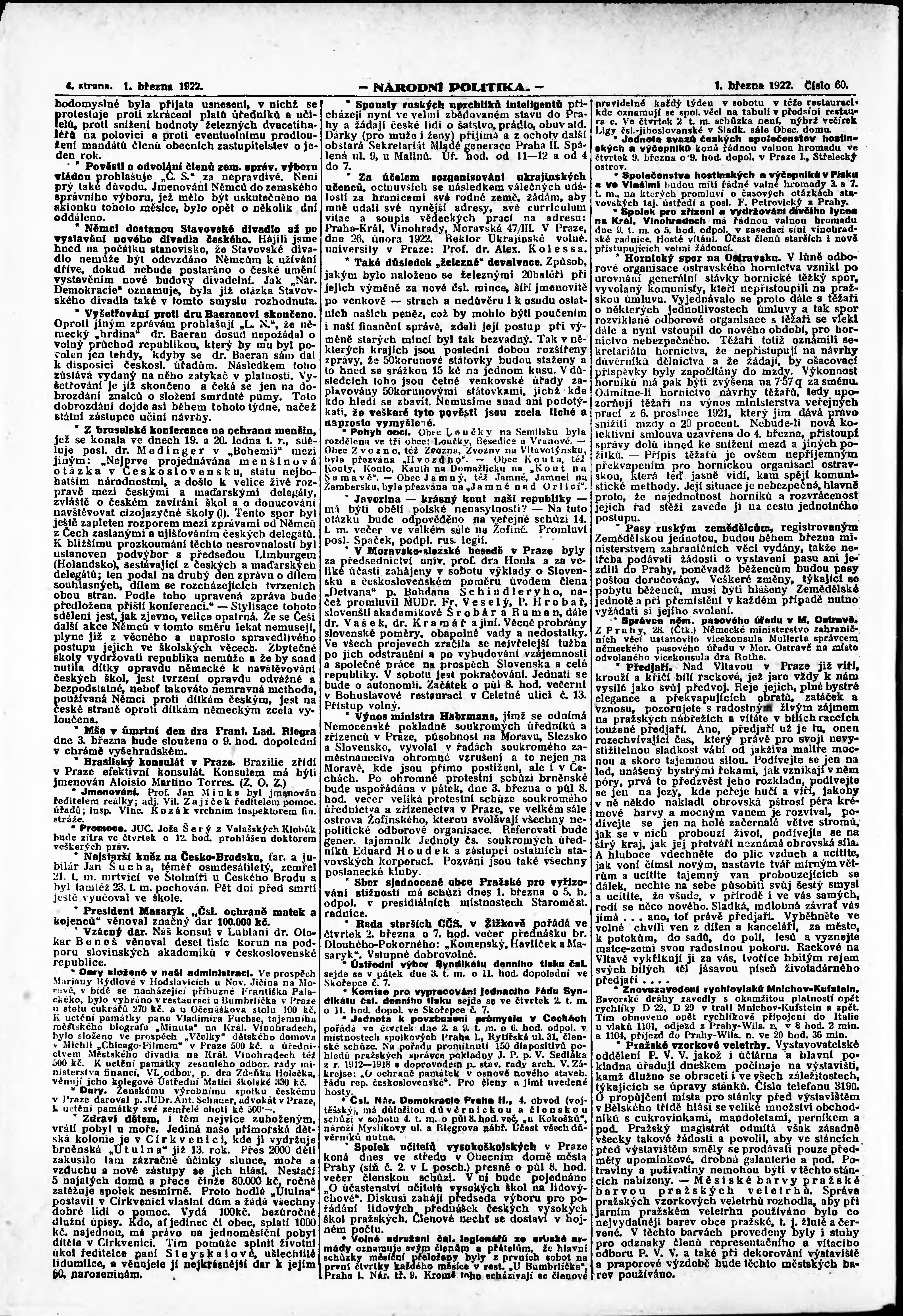 * Datum vydání výtisku: 1.3.1922 Číslo výtisku: 60 Poznámky k výtisku: ranní vydání; vydání pro Prahu;