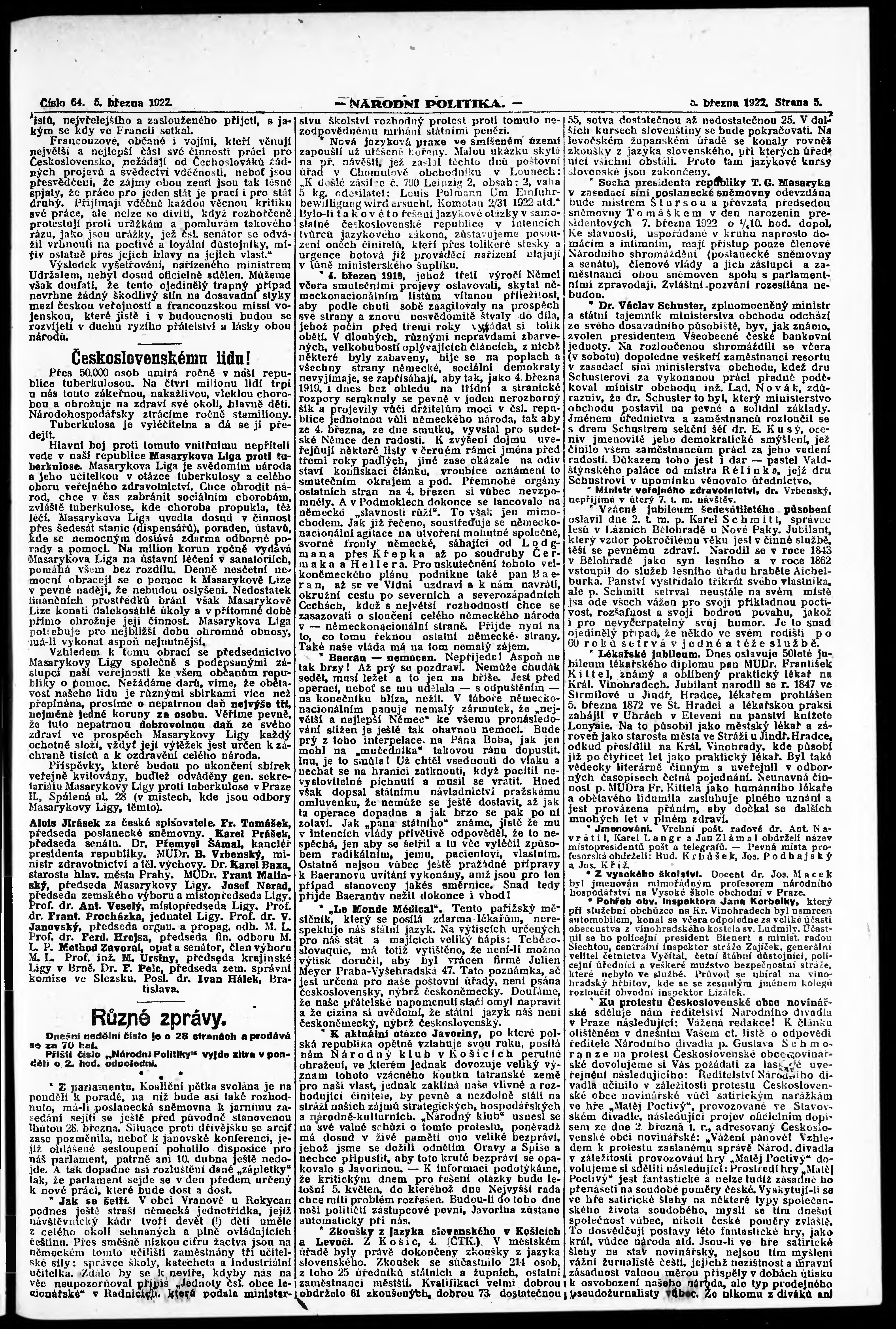 * Datum vydání výtisku: 5.3.1922 Číslo výtisku: 64 Poznámky k výtisku: ranní vydání;