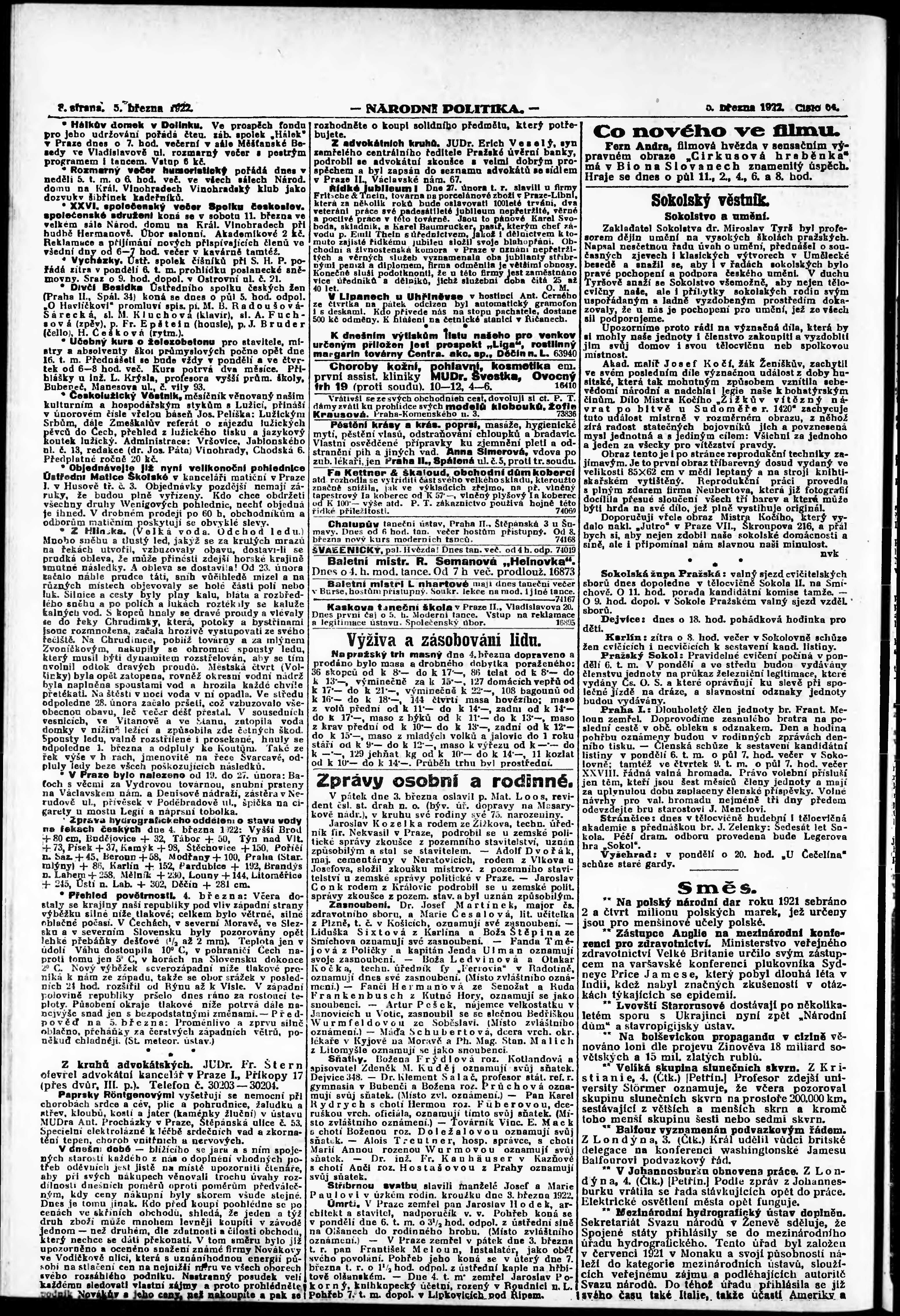 * Datum vydání výtisku: 5.3.1922 Číslo výtisku: 64 Poznámky k výtisku: ranní vydání;