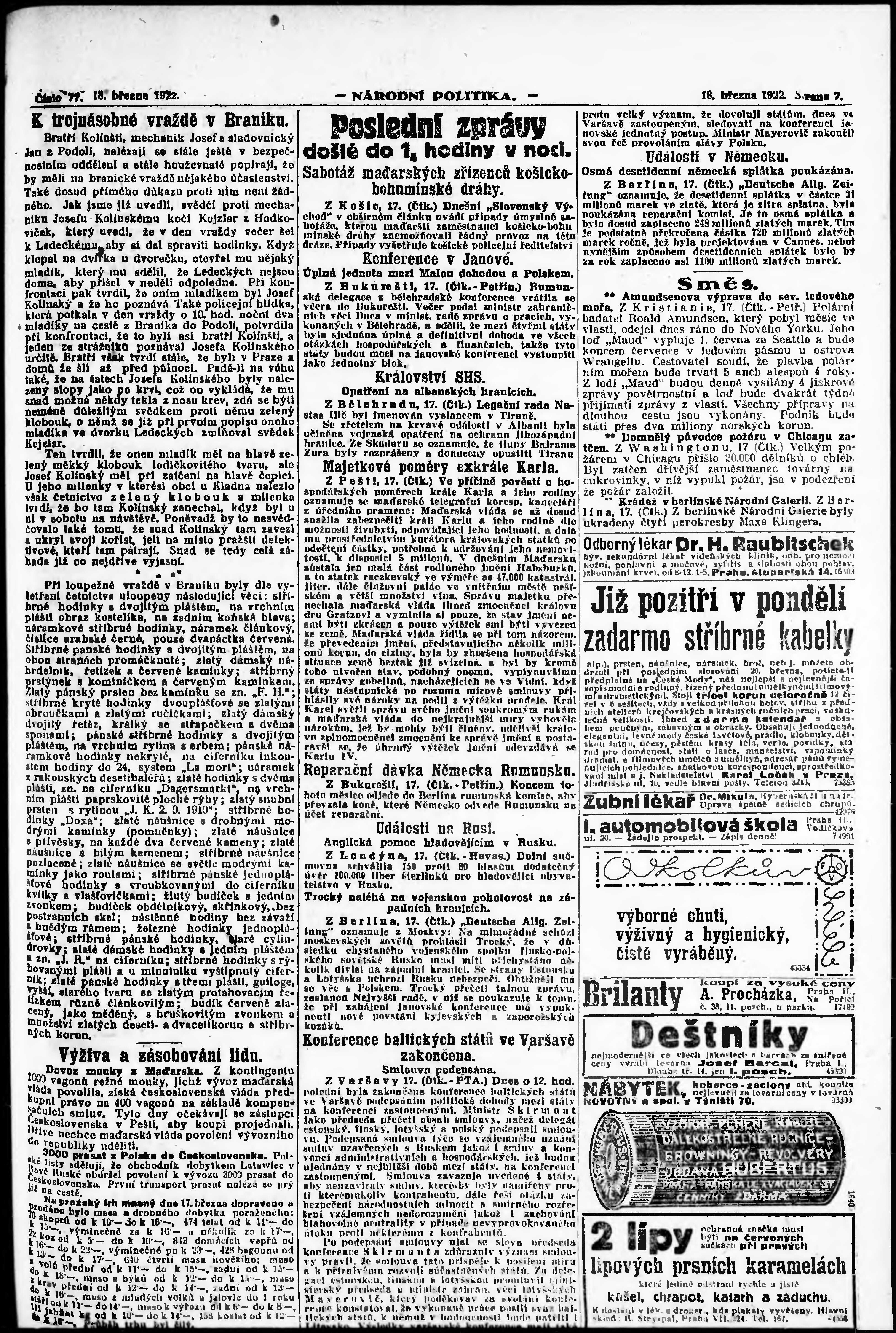 * Datum vydání výtisku: 18.3.1922 Číslo výtisku: 77 Poznámky k výtisku: ranní vydání; vydání pro Prahu;