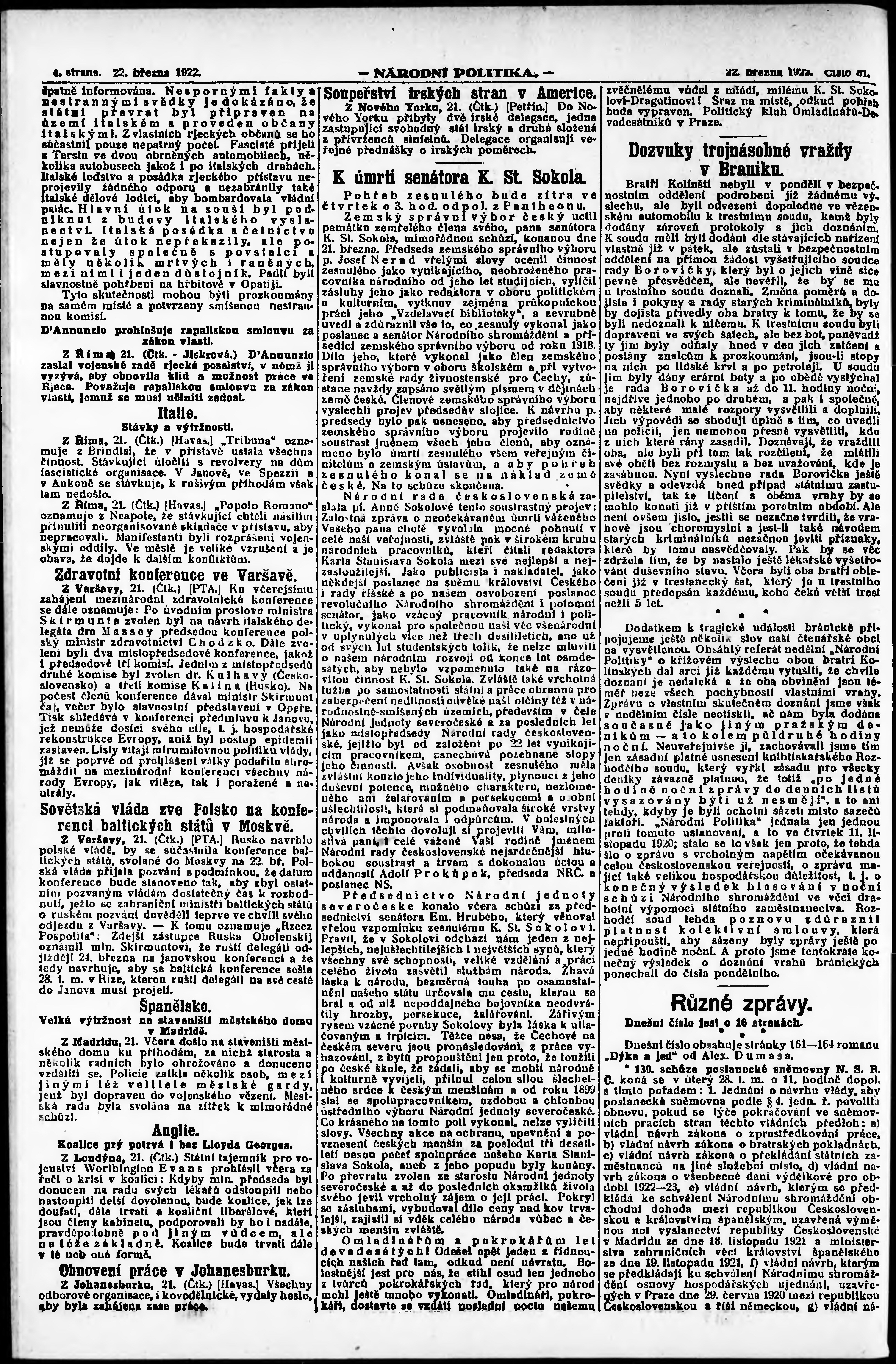 * Datum vydání výtisku: 22.3.1922 Číslo výtisku: 81 Poznámky k výtisku: ranní vydání; vydání pro Prahu;