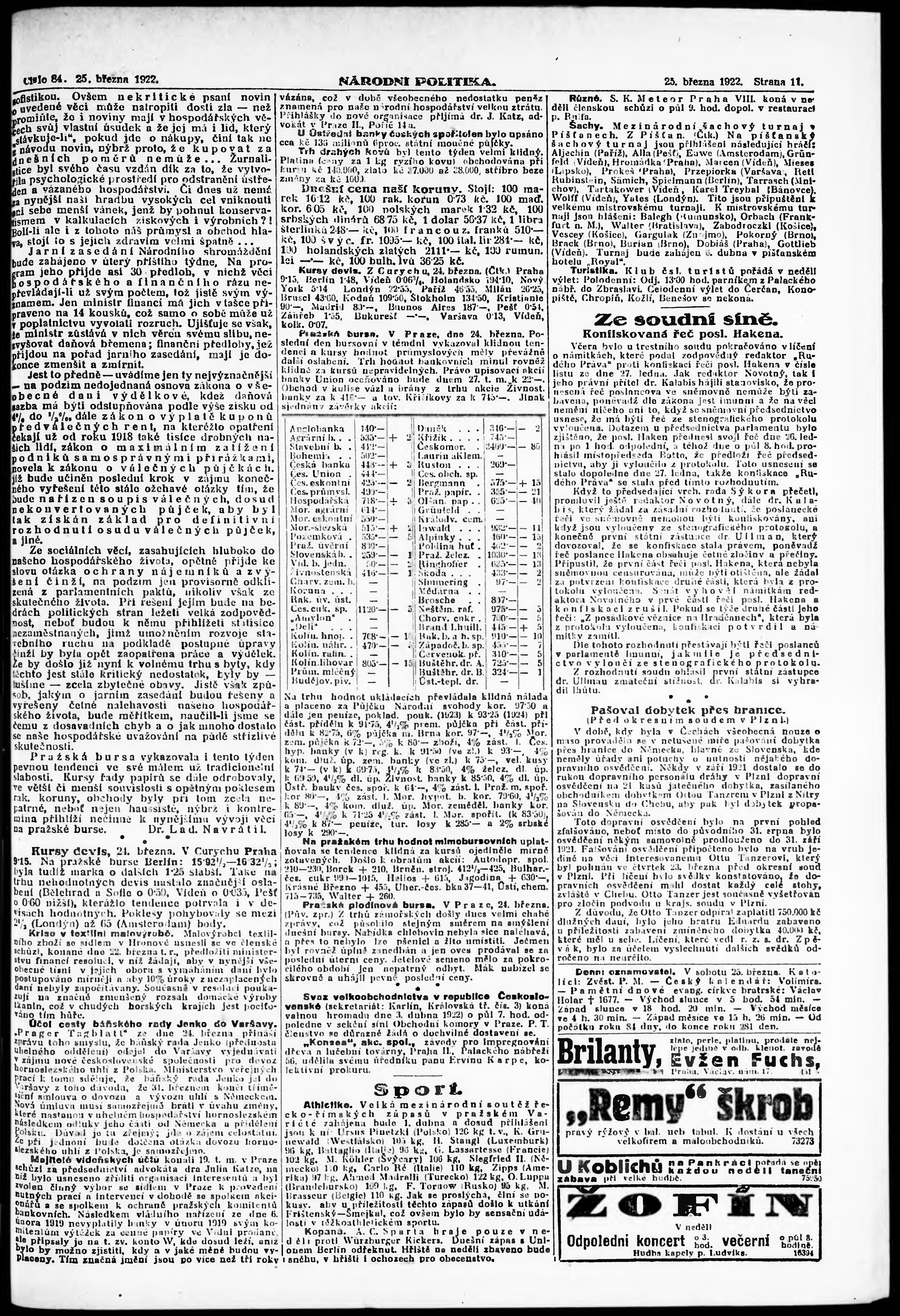 * Datum vydání výtisku: 25.3.1922 Číslo výtisku: 84 Poznámky k výtisku: ranní vydání;