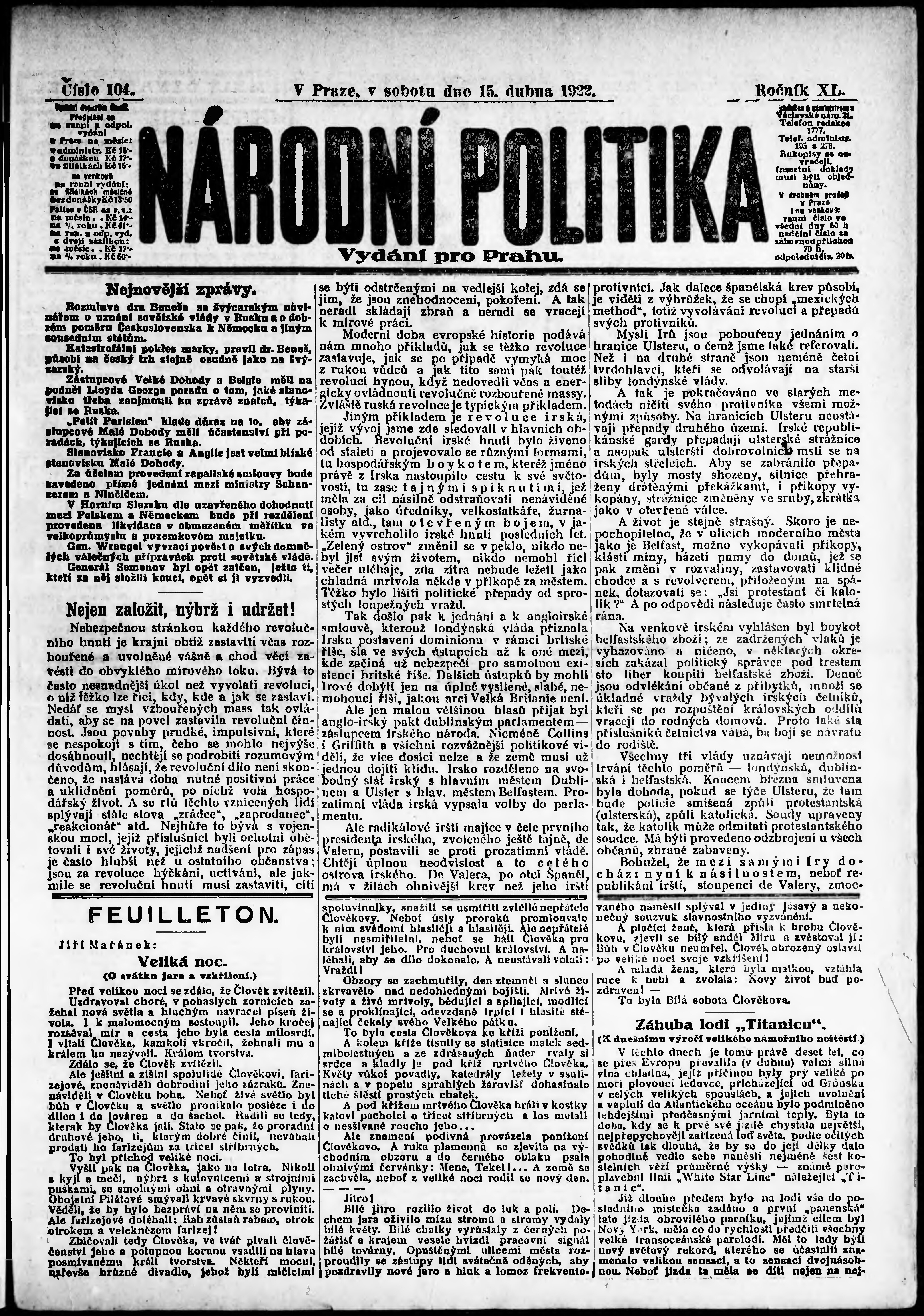 * Datum vydání výtisku: 15.4.1922 Číslo výtisku: 104 Poznámky k výtisku: ranní vydání; vydání pro Prahu;