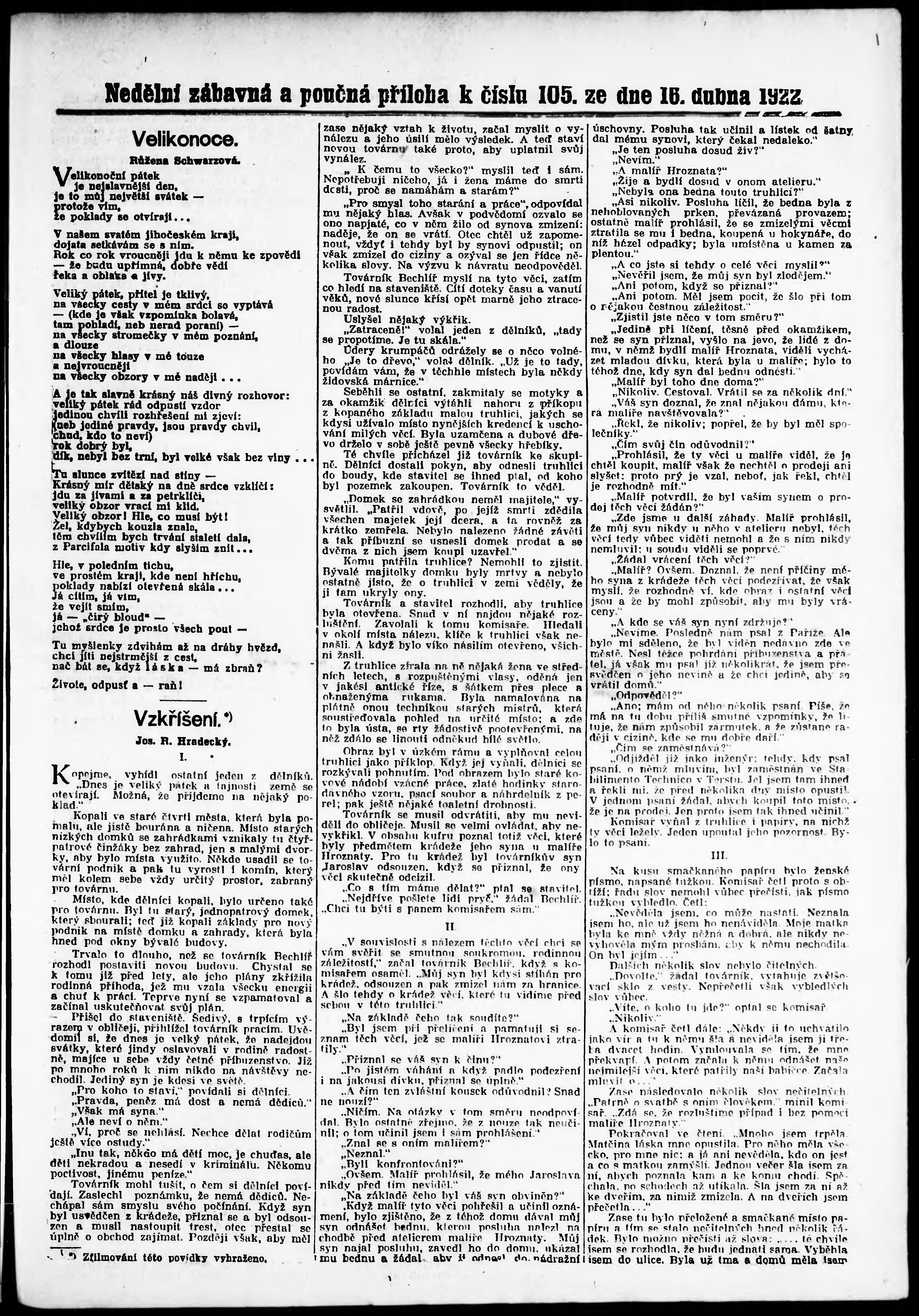 * Datum vydání výtisku: 16.4.1922 Číslo výtisku: 105 Typ výtisku: příloha