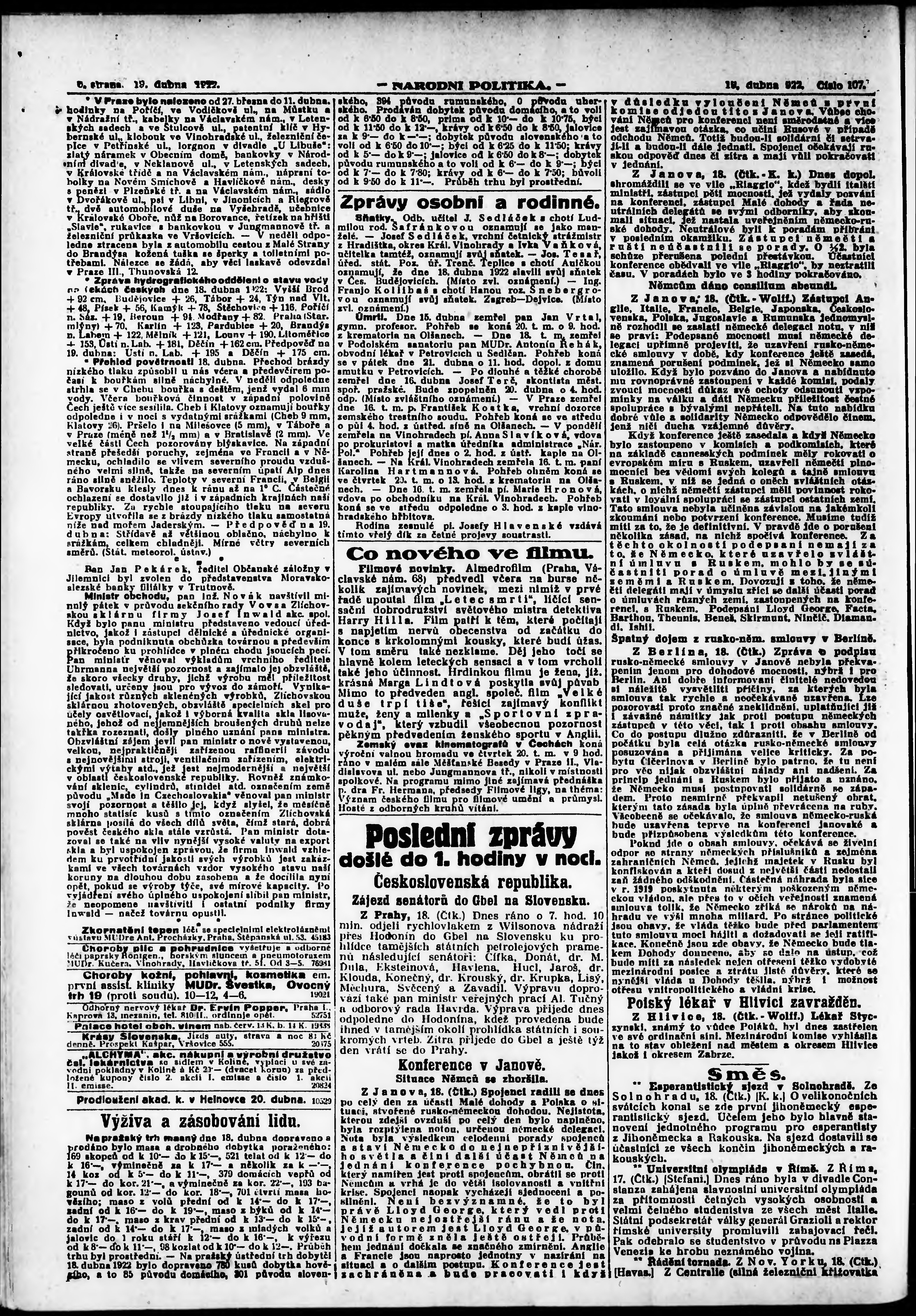 * Datum vydání výtisku: 19.4.1922 Číslo výtisku: 107 Poznámky k výtisku: ranní vydání; vydání pro Prahu;